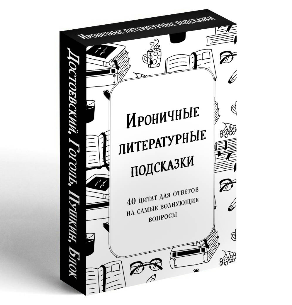 Ты смотришь на колоду метафорических карт с цитатами великих классиков. Каждая фраза в ней отобрана командой ТГ-канала «Лайфстайл», проведшей многие часы за изучением писем, дневников, заметок писателей прошлого. Внутри тебя ждет 40 карт удобного формата 75x117 мм из плотного и приятного на ощупь картона. На каждой карте расположена цитата, наполненная мудростью классиков - не тем поучающим и снисходительным знанием жизни, но по-настоящему житейской, ироничной, а иногда и в меру едкой опытностью! Все, что тебе надо, это позволить писателям взять тебя за руку и вести по дороге жизни, а потом вытянуть карту. Так ты получишь ответ прямиком из меланхоличных дневников Толстого, ироничных писем Чехова и хулиганских заметок Пушкина. В колоде тебя ждет: • Житейская мудрость из дневников, записных книжек и писем Льва Николаевича Толстого. • Ирония, самокритичность и тонкие жизненные наблюдения из писем и дневников Антона Павловича Чехова. • Сатира и фантасмагория из дневников и писем Михаила Афанасьевича Булгакова. • Меланхолия, рефлексия и язвительные замечания из дневников и писем Фёдора Михайловича Достоевского. • Хулиганство, волокитство за барышнями и стычки с царями из дневников и писем Александра Сергеевича Пушкина. • Рассуждения о земном и вечном из писем, дневников и записных книжек Николая Васильевича Гоголя. Приобретай продукты серии «Дневники писателей», открывай для себя самокритичность Чехова, меланхолию Достоевского, хулиганство Пушкина и стремись к их вершинам!| Издательство | ООО "Издательство "Эксмо" |