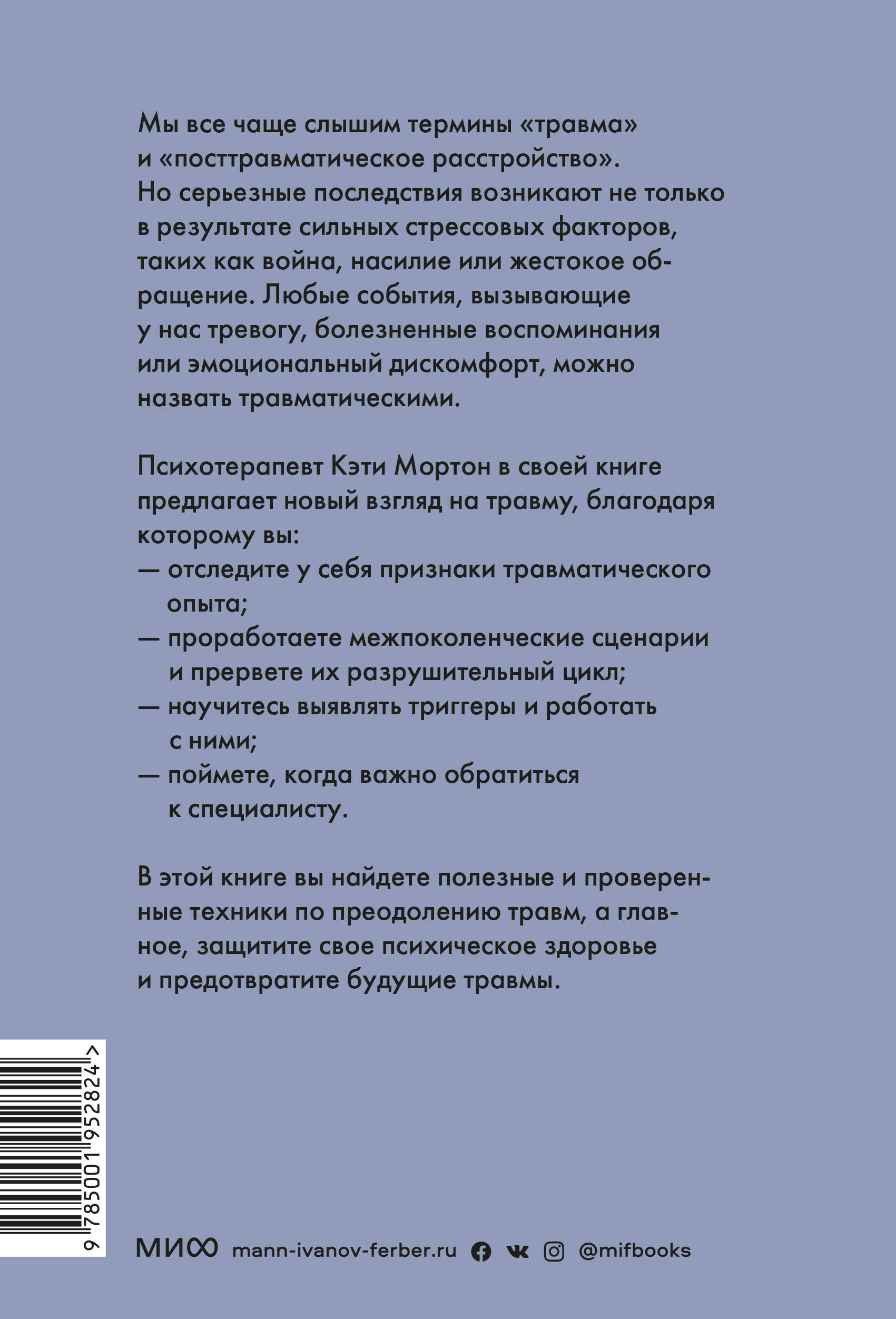 Практичная и поддерживающая книга, которая поможет отследить признаки травматического опыта, преодолеть его и защитить психику от травм в будущем. Многие думают, что травма возникает только в результате очень сильных стрессовых событий, таких как насилие или жестокое обращение. Но травма - это эмоциональная реакция, причиной которой может стать любое беспокоящее событие или нехватка ощущения безопасности. Даже поток новостей способен вызвать стресс. А еще мы "подхватываем" травмы наших близких: они передаются от поколения к поколению. Так что с травматичным опытом сталкивается любой из нас. Психотерапевт Кэти Мортон предлагает новый взгляд на травму. Только осознав, как она определяется, мы сможем преодолеть последствия. В книге вы найдете проверенные способы исцеления травмы, а также узнаете, что наносит вред вашему психическому здоровью и как с этим справиться. Книга поможет отследить у себя признаки травматического опыта, проработать межпоколенческие сценарии и прервать их разрушительный цикл, научиться выявлять триггеры и сделать так, чтобы травма больше не определяла вашу жизнь. От автора: Я хочу предложить вам терапевтические инструменты и техники, чтобы вы могли переосмыслить произошедшее, встать на путь исцеления, оставить случившееся позади и жить дальше той жизнью, которую вы заслуживаете. Мне хотелось бы, чтобы истории других людей помогли вам принять ваши чувства и напомнили, что вы не одиноки в своей ситуации. Я постараюсь разъяснить, что такое травма и какие ощущения она вызывает, дать ресурсы для работы над решением проблем. Надеюсь, я помогу многим людям почувствовать себя видимыми, понять, что их слышат, и обрести силы вернуть себе свою жизнь.| Издательство | Манн, Иванов и Фербер |