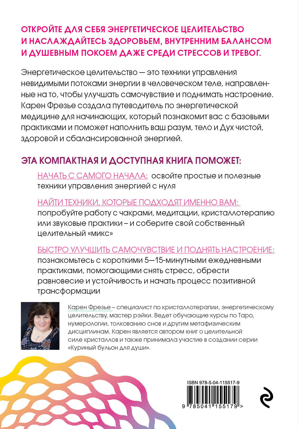 Откройте для себя энергетическое целительство - и наслаждайтесь здоровьем, внутренним балансом и душевным покоем даже среди стрессов и тревог. Энергетическое целительство - это техники управления невидимыми потоками энергии в человеческом теле, направленные на то, чтобы улучшать самочувствие и поднимать настроение. Специалист по энергетической медицине и кристаллотерапии Карен Фрезье создала доступный и понятный путеводитель по энергетической медицине для начинающих, который познакомит вас с базовыми практиками, способными наполнить ваш разум, тело и дух чистой, здоровой и сбалансированной энергией. Эта книга поможет вам: • Начать с самого начала: освойте простые и полезные техники управления энергией «с нуля». • Найти техники, которые подходят именно вам: попробуйте работу с чакрами, медитации, кристаллотерапию или звуковые практики - и соберите свой собственный целительный «микс». • Быстро улучшить самочувствие и поднять настроение: познакомьтесь с короткими 5-15-минутными ежедневными практиками, помогающими снять стресс, обрести равновесие и устойчивость и начать процесс позитивной трансформации. Карен Фрезье - специалист по кристаллотерапии, энергетическому целительству, мастер рэйки. Ведет обучающие курсы по Таро, нумерологии, толкованию снов и другим метафизическим дисциплинам. Карен является автором книг о целительной силе кристаллов, также принимала участие в создании серии «Куриный бульон для души».