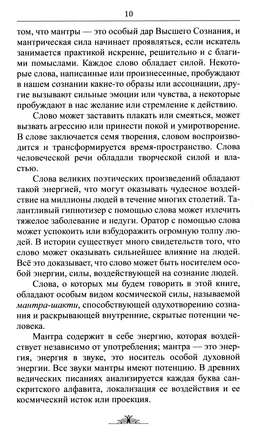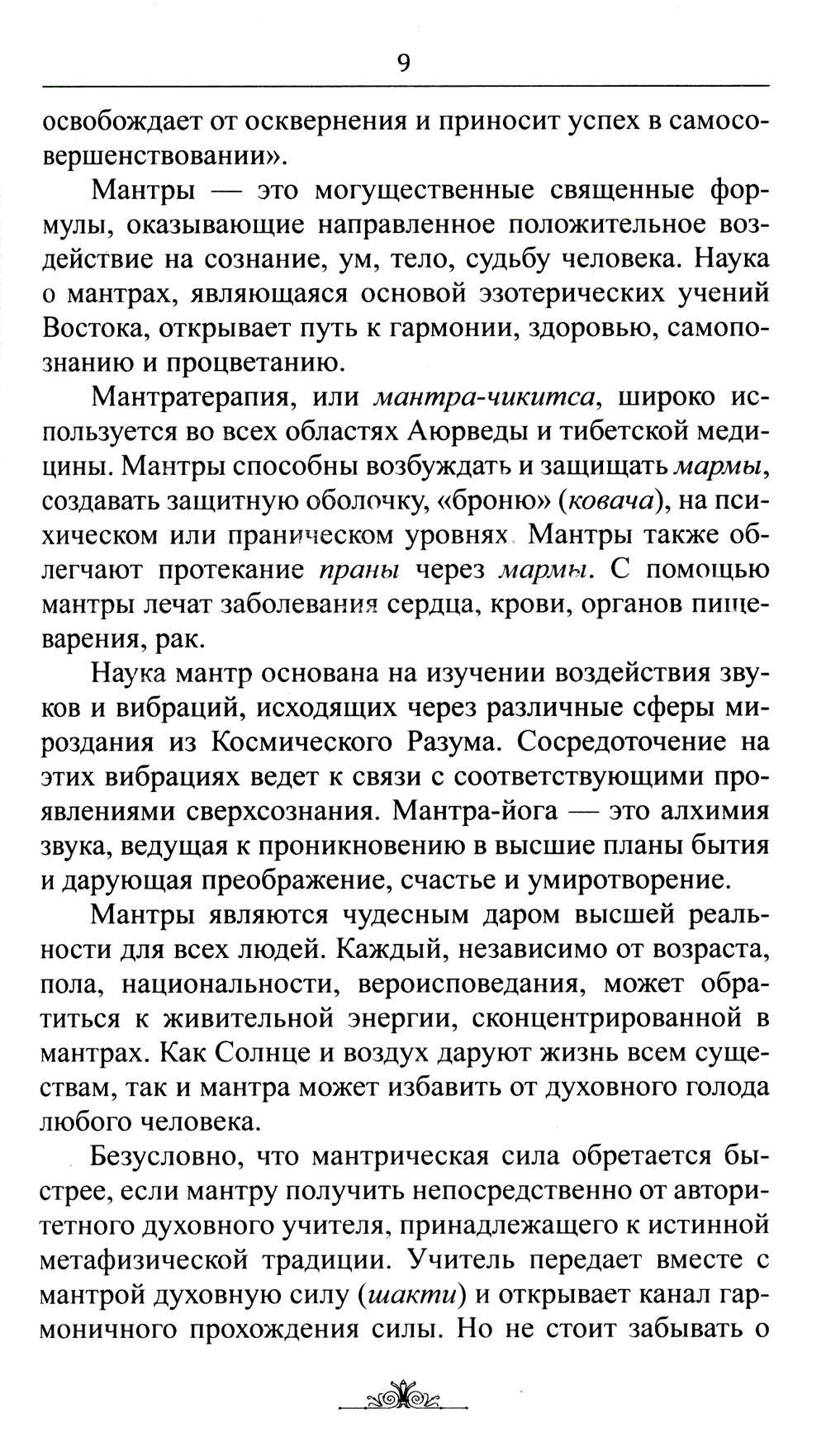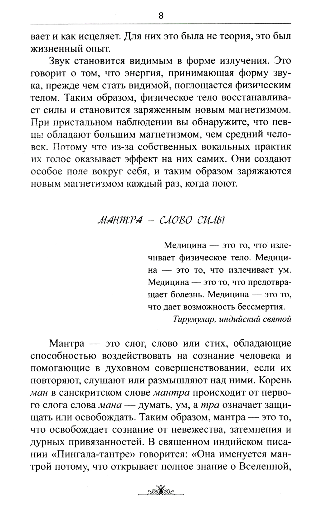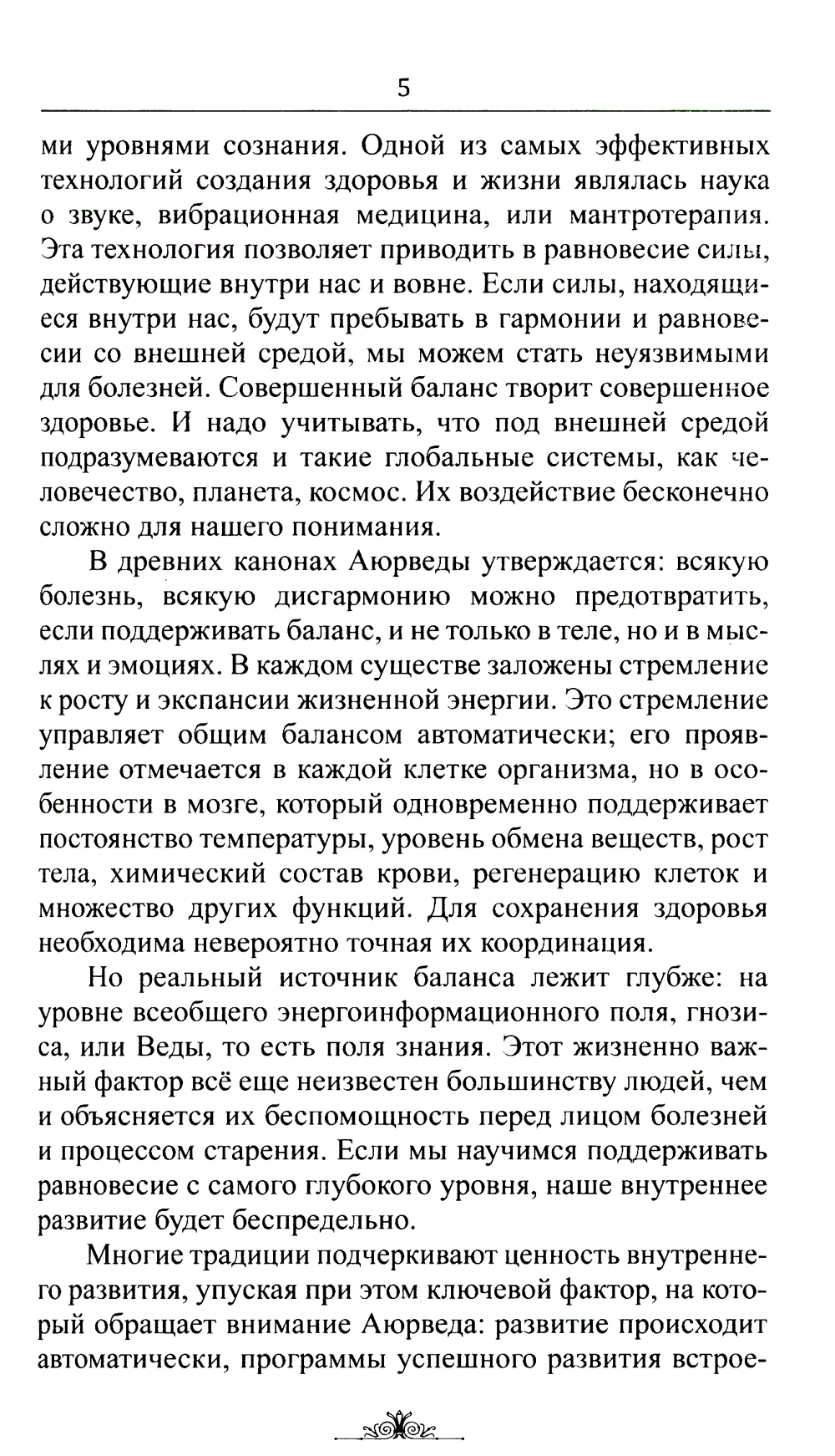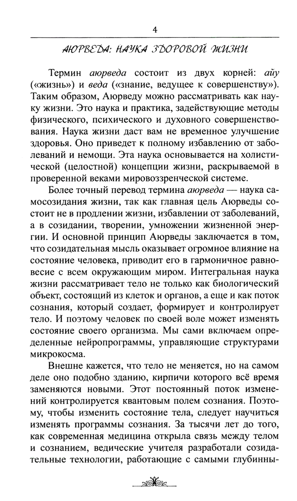Аюрведа («айу» - жизнь и «веда» - знание, ведущее к совершенству) - это наука жизни, использующая методы физического, психического и духовного совершенствования. С точки зрения Аюрведы тело - не только биологический объект, состоящий из клеток и органов, а еще и поток сознания, который создает, формирует и контролирует все процессы. И поэтому человек по своей воле может изменять состояние своего организма. За тысячи лет до того, как современная медицина открыла связь между телом и сознанием, ведические учителя разработали созидательные технологии, работающие с самыми глубинными уровнями сознания. Одной из них являлась наука о звуке, вибрационная медицина, или мантротерапия. Если мы научимся поддерживать равновесие не только в теле, но и в мыслях и эмоциях, то преодолеем беспомощность перед лицом болезней и процессом старения, а наше внутреннее развитие будет беспредельно.