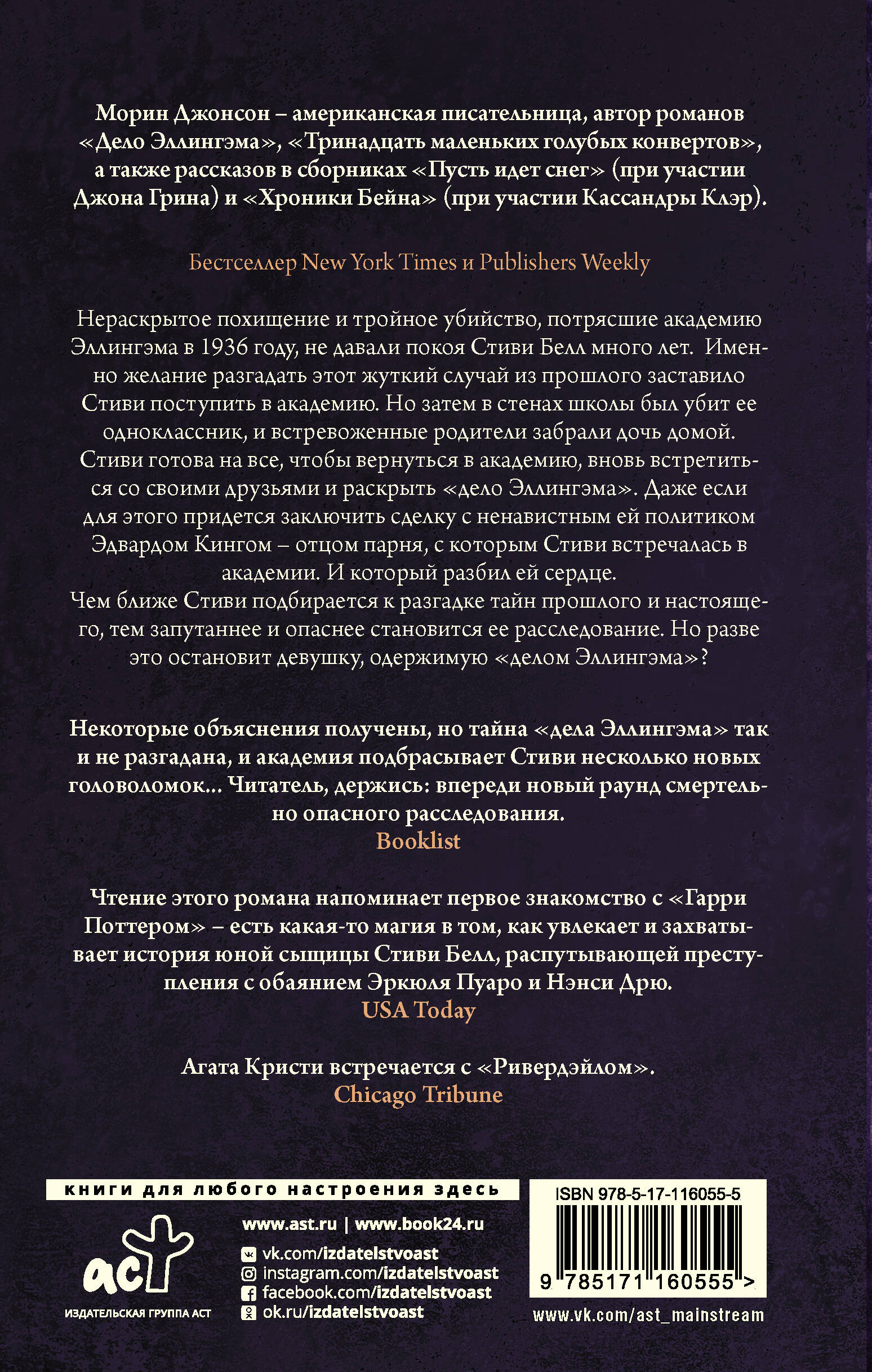 Нераскрытое похищение и тройное убийство, потрясшие академию Эллингема в 1936 году, не давали покоя Стиви Белл много лет. Именно желание разгадать этот жуткий случай из прошлого заставило Стиви поступить в академию. Но затем в стенах школы был убит ее одноклассник, и встревоженные родители забрали дочь домой. Стиви готова на все, чтобы вернуться в академию, вновь встретиться со своими друзьями и раскрыть "дело Эллингэма". Даже если для этого придется заключить сделку с ненавистным ей политиком Эдвардом Кингом - отцом парня, с которым Стиви встречалась в академии. И который разбил ей сердце. Чем ближе Стиви подбирается к разгадке тайн прошлого и настоящего, тем запутаннее и опаснее становится ее расследование. Но разве это остановит девушку, одержимую "делом Эллингэма"?| Издательство | ИЗДАТЕЛЬСТВО "АСТ" |