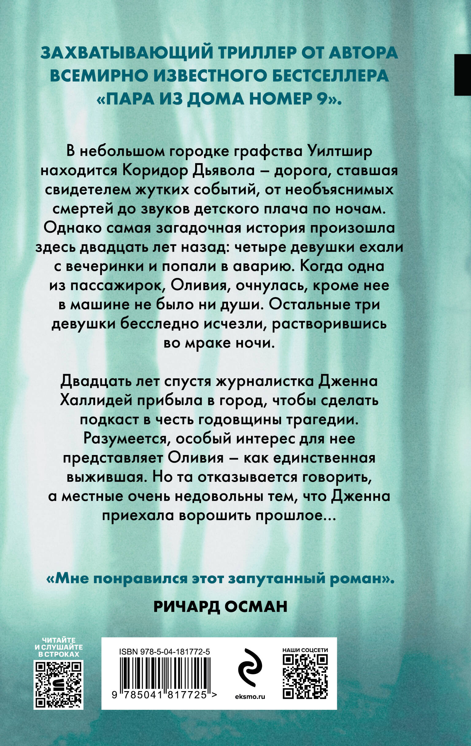 Бестселлер № 1 по версии «SUNDAY TIMES». ТОП-100 AMAZON. Захватывающий триллер от автора всемирно известного бестселлера «Пара из дома номер 9». В небольшом городке графства Уилтшир находится Коридор Дьявола - дорога, ставшая свидетелем жутких событий, от необъяснимых смертей до звуков детского плача по ночам. Однако самая загадочная история произошла здесь двадцать лет назад: четыре девушки ехали с вечеринки и попали в аварию. Когда одна из пассажирок, Оливия, очнулась, кроме нее в машине не было ни души. Остальные три девушки бесследно исчезли, растворившись во мраке ночи. Двадцать лет спустя журналистка Дженна Халлидей прибыла в город, чтобы сделать подкаст в честь годовщины трагедии. Разумеется, особый интерес для нее представляет Оливия - как единственная выжившая. Но та отказывается говорить, а местные очень недовольны тем, что Дженна приехала ворошить прошлое… _________________________________________________________________________________________________________________ «Умно. Захватывающе. Неотразимо. Я не могла оторваться». - Сара Пирс «Мне понравился этот запутанный роман». - Ричард Осман «До мурашек». - The Sunday Times «Поразительные героини и извилистый сюжет». - Daily Mail «Дуглас - королева неожиданных поворотов». - Джиллиан Макаллистер «Захватывающий, атмосферный роман. Клэр Дуглас создала еще одну леденящую душу историю, которая понравится читателям». - Джилли Макмиллан «Сказочно жуткая история, от которой мурашки бегут по спине. Клэр Дуглас - мастер рассказывания историй. Этот захватывающий триллер - идеальное захватывающее чтение. Мне очень понравилось!» - Дженис Халлетт| Издательство | ООО "Издательство "Эксмо" |