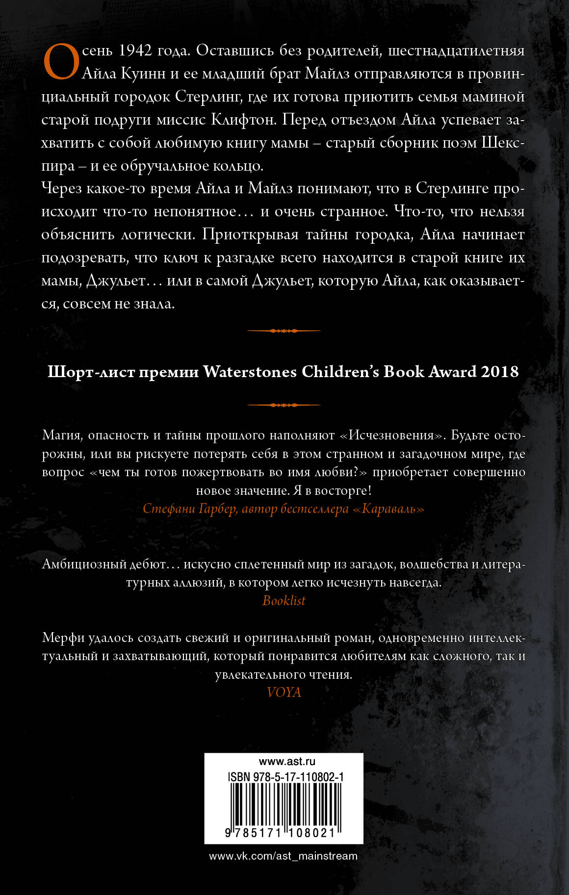 Осень 1942 года. Оставшись без родителей, шестнадцатилетняя Айла Куинн и ее младший брат Майлз отправляются в провинциальный городок Стерлинг, где их готова приютить семья маминой старой подруги миссис Клиффтон. Перед отъездом Айла успевает захватить с собой любимую книгу мамы - старый сборник поэм Шекспира - и ее обручальное кольцо. Через какое-то время Айла и Майлз понимают, что в Стерлинге происходит что-то непонятное… и очень странное. Что-то, что нельзя объяснить логически. Приоткрывая тайны городка, Айла начинает подозревать, что ключ к разгадке всего находится в старой книге их мамы, Джульет… или в самой Джульет, которую Айла, как оказывается, совсем не знала.| Издательство | ИЗДАТЕЛЬСТВО "АСТ" |