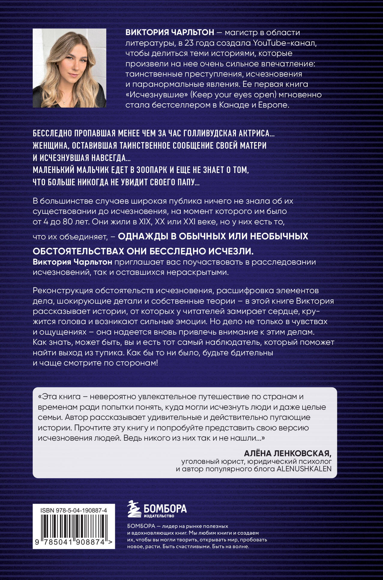 Реконструкция обстоятельств исчезновения, расшифровка элементов дела, забавные детали и собственные теории - в этой книге Виктория Чарльтон рассказывает истории, от которых у читателей замирает сердце, кружится голова и возникают сильные эмоции. Но дело не только в чувствах и ощущениях - она надеется вновь привлечь внимание к этим реальным историям. Как знать, может быть, вы и есть тот самый свидетель, который поможет найти выход из тупика. Как бы то ни было, будьте бдительны!| Издательство | ООО "Издательство "Эксмо" |