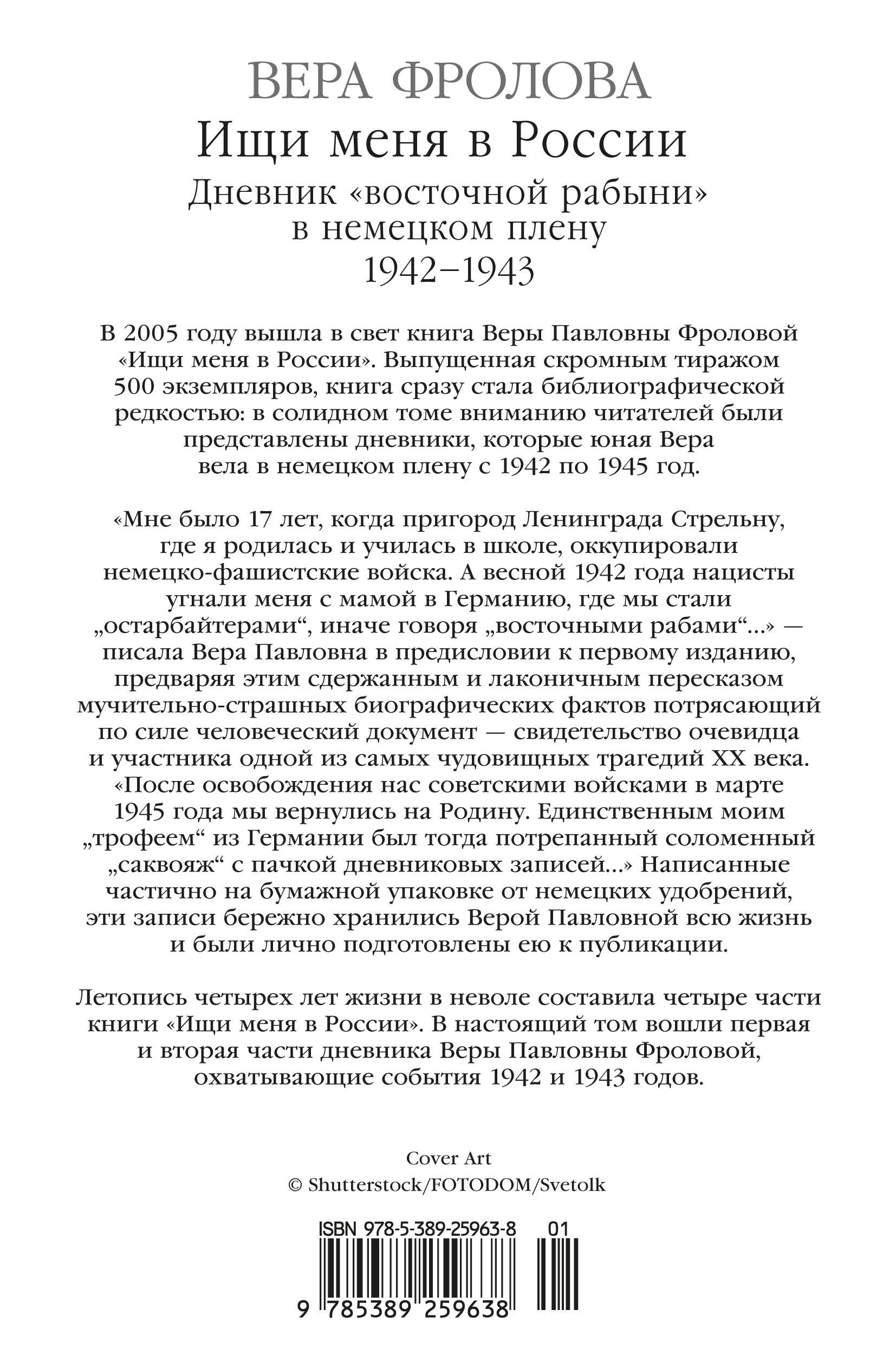В 2005 году вышла в свет автобиографическая книга Веры Павловны Фроловой "Ищи меня в России". Выпущенная скромным тиражом 500 экземпляров, книга немедленно стала библиографической редкостью: в солидном томе вниманию читателей были представлены дневники, которые юная Вера вела в немецком плену с 1942 по 1945 год. "Мне было 17 лет, когда пригород Ленинграда Стрельну, где я родилась и училась в школе, оккупировали немецко-фашистские войска. А весной 1942 года нацисты угнали меня с мамой в Германию, где мы стали "остарбайтерами", иначе говоря "восточными рабами"..." - писала Вера Павловна в предисловии к первому изданию, предваряя этим сдержанным и лаконичным пересказом мучительно-страшных биографических фактов потрясающий по силе человеческий документ - свидетельство очевидца и участника одной из самых чудовищных трагедий XX века. "После освобождения нас советскими войсками в марте 1945 года мы вернулись на Родину. Единственным моим "трофеем" из Германии был тогда потрепанный соломенный "саквояж" с пачкой дневниковых записей..." Написанные частично на бумажной упаковке от немецких удобрений, эти записи бережно хранились Верой Павловной всю жизнь и были лично подготовлены ею к публикации. Летопись четырех лет жизни в неволе составила четыре части книги "Ищи меня в России". В настоящий том вошли первая и вторая части дневника Веры Павловны Фроловой, охватывающие события 1942 и 1943 годов.| Издательство | Азбука-Аттикус Издат.группа ООО |