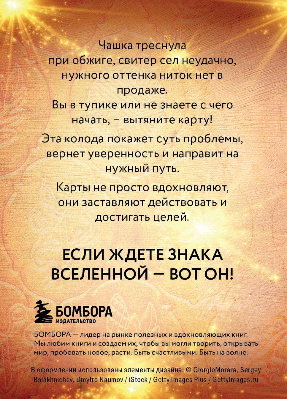 Чашка треснула при обжиге, свитер сел неудачно, нужного оттенка ниток нет в продаже. Вы в тупике или не знаете, с чего начать? Вытяните карту! Автор иллюстраций Даниил Чернов - художник, которому близко ручное творчество, и он создал колоду специально для единомышленников. Иллюстрации в уникальном авторском стиле честно показывают этапы работы над изделием - провалы и удачи, нерешительность и наслаждение результатом. На оборотной стороне карт - метафорические описания и вопросы, наталкивающими на размышления - все, чтобы определить суть проблемы и направить вас на нужный путь. Карты не просто вдохновляют, они заставляют действовать и достигать целей. Если ждете знака Вселенной - это он!| Издательство | ООО "Издательство "Эксмо" |