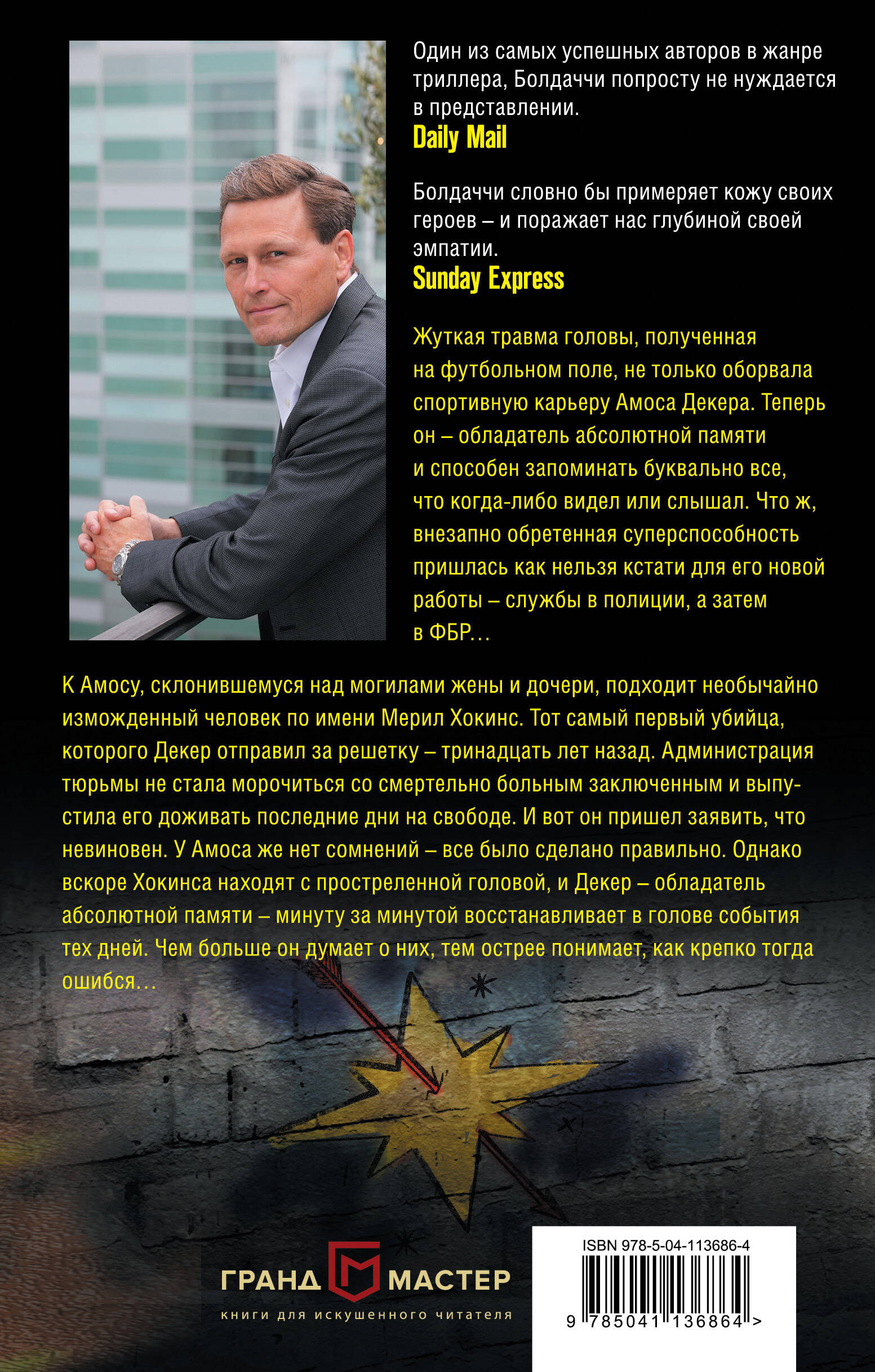 Бестселлер #1 New York Times. В мире продано более 130 000 000 копий романов автора. Жуткая травма головы, полученная на футбольном поле, не только оборвала спортивную карьеру Амоса Декера. Теперь он - обладатель абсолютной памяти и способен запоминать буквально все, что когда-либо видел или слышал. Что ж, внезапно обретенная суперспособность пришлась как нельзя кстати для его новой работы - службы в полиции, а затем в ФБР… К Амосу, склонившемуся над могилами жены и дочери, подходит необычайно изможденный человек по имени Мерил Хокинс. Тот самый первый убийца, которого Декер отправил за решетку - тринадцать лет назад. Администрация тюрьмы не стала морочиться со смертельно больным заключенным и выпустила его доживать последние дни на свободе. И вот он пришел заявить, что невиновен. У Амоса же нет сомнений - все было сделано правильно. Однако вскоре Хокинса находят с простреленной головой, и Декер - обладатель абсолютной памяти - минуту за минутой восстанавливает в голове события тех дней. Чем больше он думает о них, тем острее понимает, как крепко тогда ошибся… Дэвид Болдаччи - настоящий классик остросюжетного жанра. Он выпустил более 40 произведений, переведенных более чем на 45 языков и вышедших в более чем 80 странах общим тиражом более 130 000 000 экземпляров; при этом каждый его роман становился международным мегабестселлером. Его имя занесено в Международный зал славы писателей криминального жанра. Романы Дэвида называл в числе своих любимых президент США Билл Клинтон. По его роману «Абсолютная власть» был снят одноименный киноблокбастер, режиссером и исполнителем главной роли в котором стал Клинт Иствуд. Также по романам Дэвида был снят популярный телесериал «Кинг и Максвелл» (2013). В довершение ко всему, в 1997 году журнал «Пипл» включил Болдаччи в список 50 самых красивых людей планеты. «Очередной великолепный роман выдающегося мастера». - Associated Press «Амос Декер - один из самых необычных сыщиков в литературе, о котором мечтал бы любой писатель остросюжетного жанра». - Washington Post «И снова вы можете произнести слова «Болдаччи», «бестселлер» и «киносценарий», не переводя дыхание». - Chicago Sun «Уже с самой первой книги читатели желают, чтобы Декер появлялся на книжных страницах снова и снова». - Kirkus Reviews «Болдаччи по-прежнему не имеет себе равных». - Sunday Times «Один из самых успешных авторов в жанре триллера, Болдаччи попросту не нуждается в представлении». - Daily Mail «Болдаччи словно бы примеряет кожу своих героев - и поражает нас глубиной своей эмпатии». - Sunday Express| Издательство | ООО "Издательство "Эксмо" |