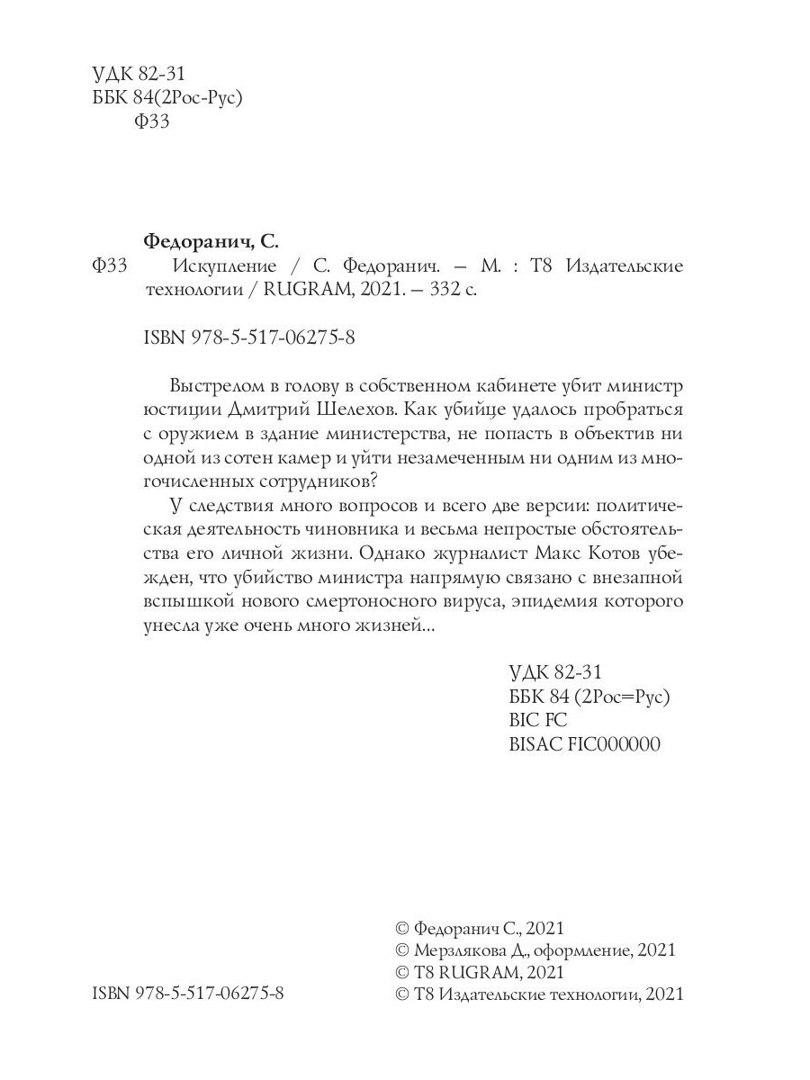 Выстрелом в голову в собственном кабинете убит министр юстиции Дмитрий Шелехов. Как убийце удалось пробраться с оружием в здание министерства, не попасть в объектив ни одной из сотен камер и уйти незамеченным ни одним из многочисленных сотрудников? У следствия много вопросов и всего две версии: политическая деятельность чиновника и весьма непростые обстоятельства его личной жизни. Однако журналист Макс Котов убежден, что убийство министра напрямую связано с внезапной вспышкой нового смертоносного вируса, эпидемия которого унесла уже очень много жизней...| Издательство | Т8 RUGRAM |