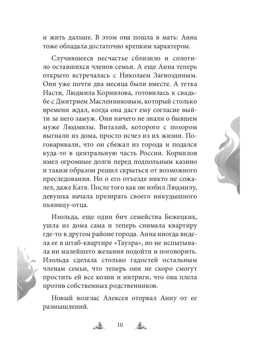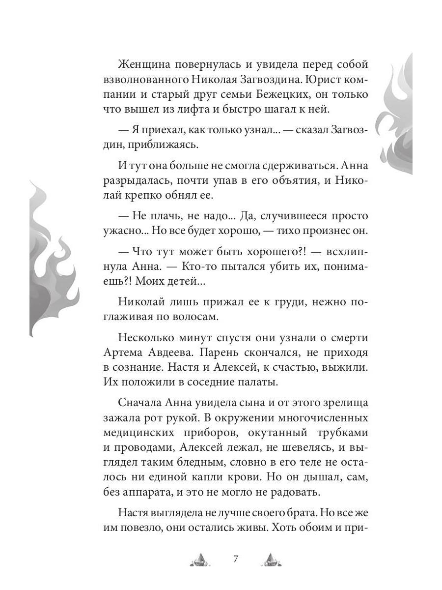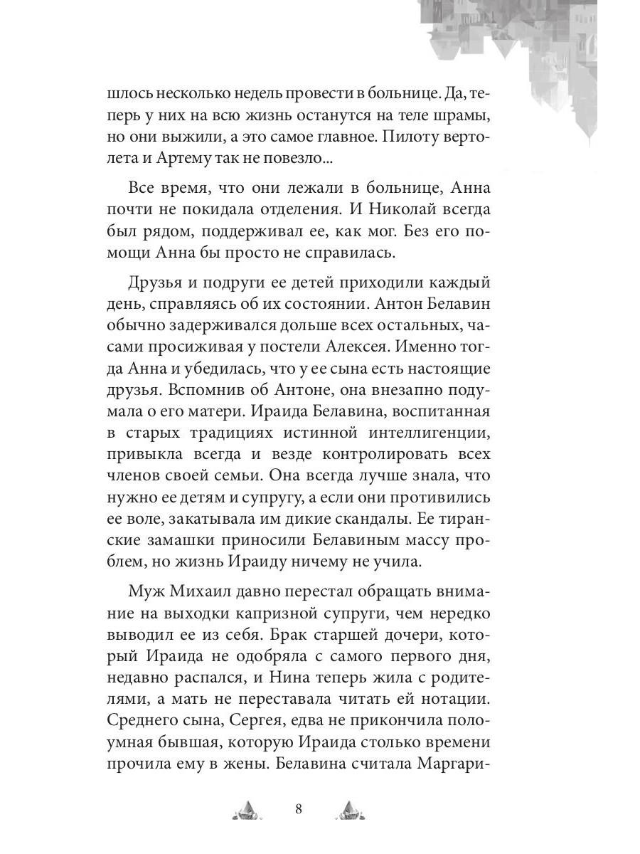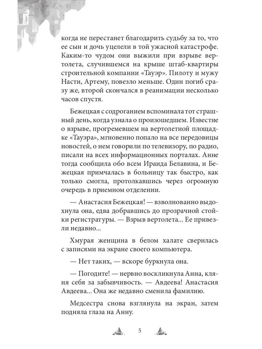 Строительство отеля «Тауэр Палас», нареченного журналистами «Хрустальным дворцом», закончено. Готовится грандиозная презентация нового здания, куда приглашено множество людей, так или иначе связанных с компанией «Тауэр». Именно эта вечеринка и станет отправной точкой, за которой последует либо полное разорение и банкротство фирмы, либо крах таинственного злоумышленника, стоящего за всеми неприятностями компании. В это же время Нина Бакшеева пытается собрать по крупицам свою разбитую жизнь. Бывший муж не отдает ей дочь, однако женщина в буквальном смысле готова на все, лишь бы вернуть себе ребенка. Лина Орлова целеустремленно продолжает продвигаться к исполнению своей мечты - стать богатой и знаменитой, - и теперь на ее пути стоит только Бэлла, супруга Виктора Ольшанского. Хитрые и изворотливые противницы стоят друг друга, и лишь одна сможет выйти победительницей из этой схватки. Настя пытается оправиться от страшного удара, уготованного ей судьбой и неизвестным махинатором. Отныне ее цель - месть за смерть близких людей. И когда выясняется, что ключ к разгадке всех происходящих в «Тауэре» событий находится в небольшой английской деревушке, где-то в окрестностях Лондона, Настя и Денис отправляются на поиски ответов на свои вопросы. А тем временем журналистка Марина пытается выйти на след Ларисы Шаховой и приходит в психиатрическую клинику, где та, по слухам, когда-то работала. Но там отважную девушку ждет ужасный сюрприз, которого никто не предвидел.| Издательство | Т8 RUGRAM |