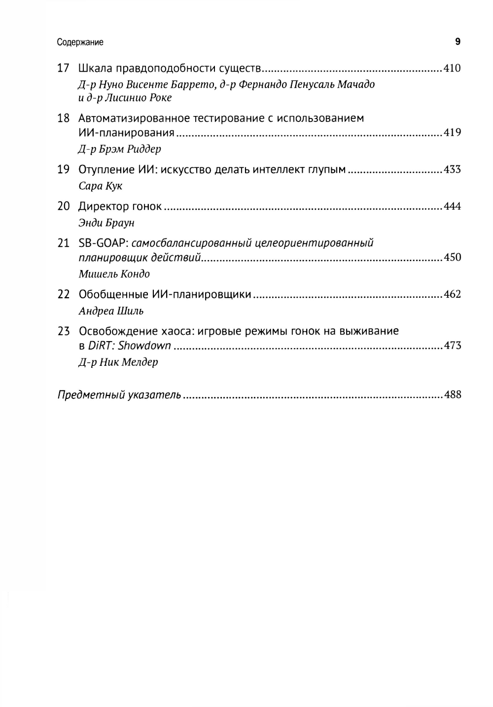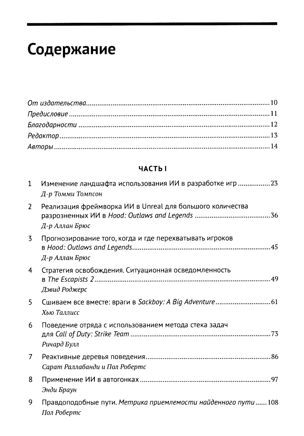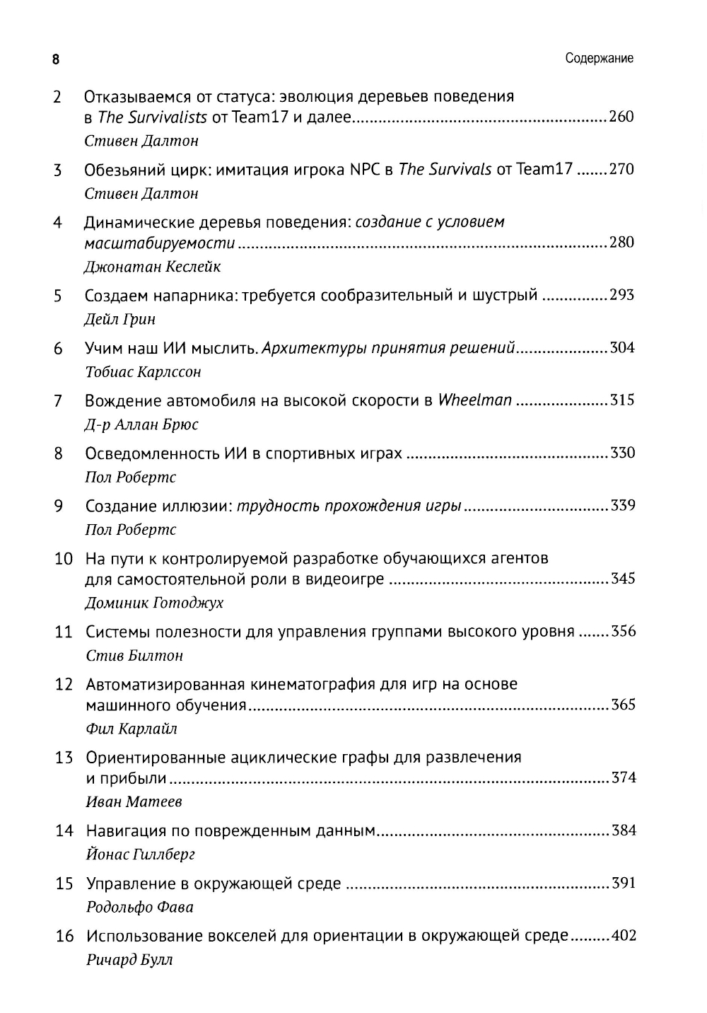 Игровой искусственный интеллект - самая интересная часть разработки игр. Это не умаляет той великолепной работы, которая проделана в области графики, физики, инструментария разработки, звука и других важных компонентов, необходимых для создания игры. Но есть что-то особенное в том, чтобы пробудить в агенте жизнь! Чтобы игрок поверил в иллюзию и остался захваченным ей, используются определенные приемы. Будь то поиск надежного пути через среду, навигация по оживленной улице, общение между агентами или создание архитектуры. Это всегда путешествие, полное открытий. Вы начинаете с базовых идей, и они развиваются, разворачиваются по мере разработки игры! В книге представлены идеи чрезвычайно талантливых программистов и дизайнеров со всего мира, из самых разных студий с целью поделиться их знаниями.