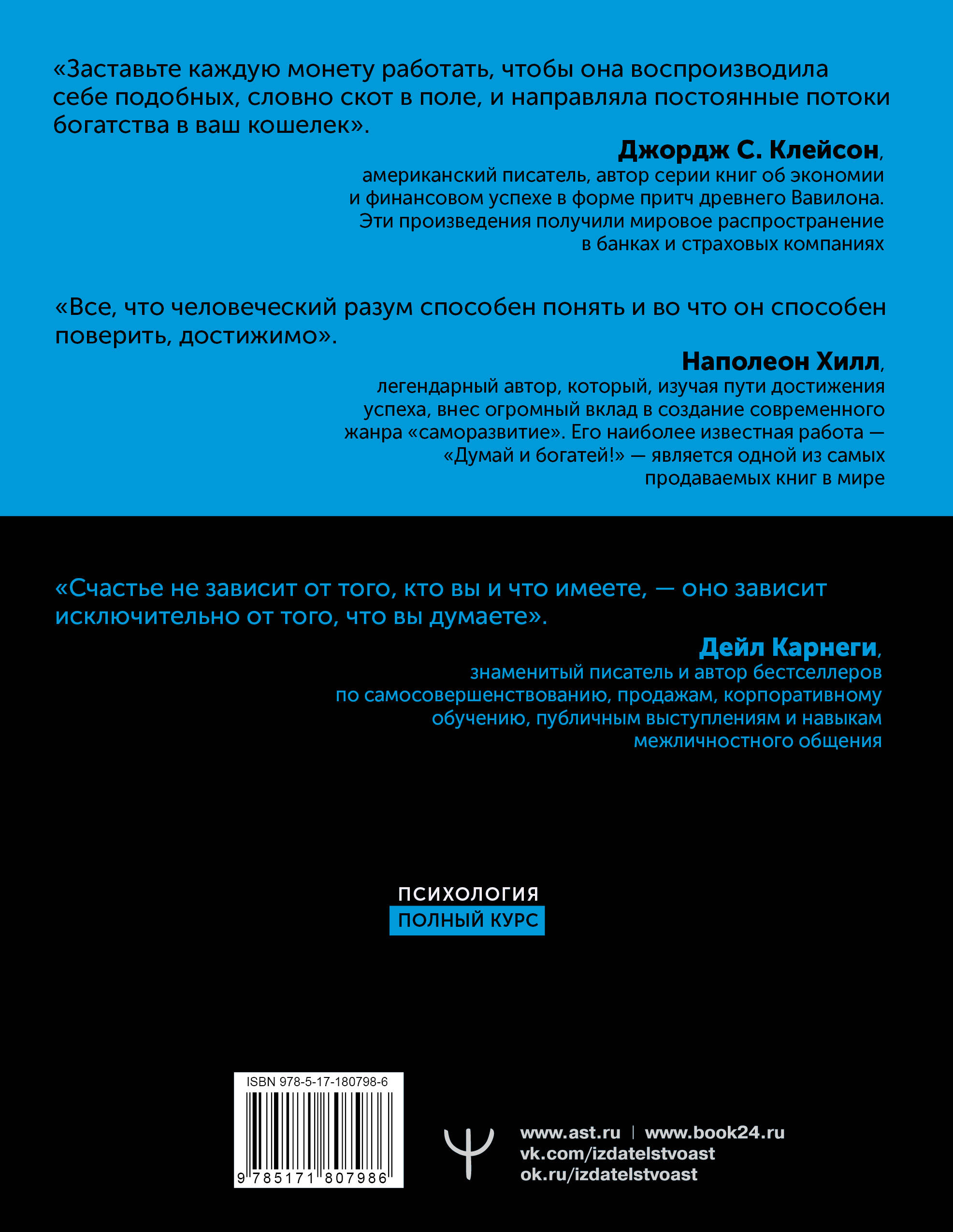 Перед вами мировая классика достижения богатства и искусства общения, секрет многих миллионеров и миллиардеров, книги, с которых начинались успешные проекты, строились корпорации и закладывались солидные счета в банках - знаменитые "Самый богатый человек в Вавилоне" Джорджа С. Клейсона, "Думай и богатей!" Наполеона Хилла и "Как выработать уверенность в себе и научиться убеждать других" Дейла Карнеги. Книги Клейсона, Хилла и Карнеги - это уникальное сочетания идей и практических советов, которые помогут вам добиться успеха и карьерного роста, настроиться на деньги, понять законы их движения, накопления и сохранения, научат, как найти самые быстрые и эффективные пути к финансовому и личностному благополучию. Не упустите свой шанс стать богаче, как это уже сделали миллионы людей по всему миру! Это книга для всех, кто: • интересуется финансовой грамотностью и хочет научиться эффективно управлять проектами; • стремится к личностному росту и самосовершенствованию в различных сферах жизни; • хочет стать счастливым, успешным, богатым и знаменитым. В сборник вошли произведения: • Джордж Сэмюэль Клейсон "Самый богатый человек в Вавилоне" • Наполеон Хилл "Думай и богатей!" • Дейл Карнеги "Как выработать уверенность в себе и научиться убеждать других"| Издательство | Издательство "АСТ" |