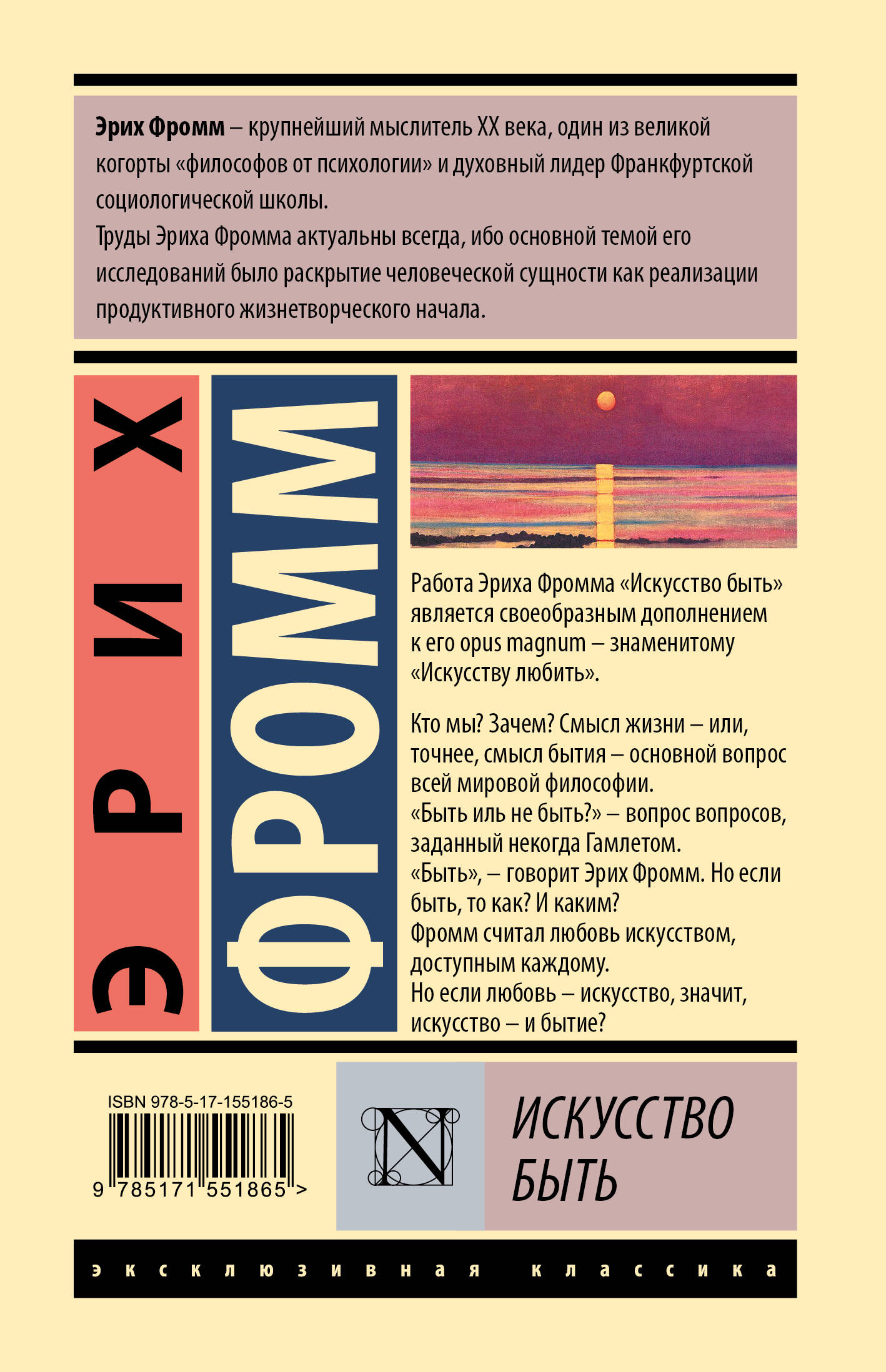 Эрих Фромм - крупнейший мыслитель ХХ века, один из великой когорты "философов от психологии" и духовный лидер Франкфуртской социологической школы. Труды Эриха Фромма актуальны всегда, ибо основной темой его исследований было раскрытие человеческой сущности как реализации продуктивного, жизнетворческого начала. Работа Эриха Фромма "Искусство быть" является своеобразным дополнением к его opus magnum - знаменитому "Искусству любить". Кто мы? Зачем? Смысл жизни - или, точнее, смысл бытия - основной вопрос всей мировой философии. "Быть иль не быть?" - вопрос вопросов, заданный некогда Гамлетом. "Быть", - говорит Эрих Фромм. Но если быть, то как? И каким? Фромм считал любовь искусством, доступным каждому. Но если любовь - искусство, значит, искусство - и бытие?| Издательство | ИЗДАТЕЛЬСТВО "АСТ" |