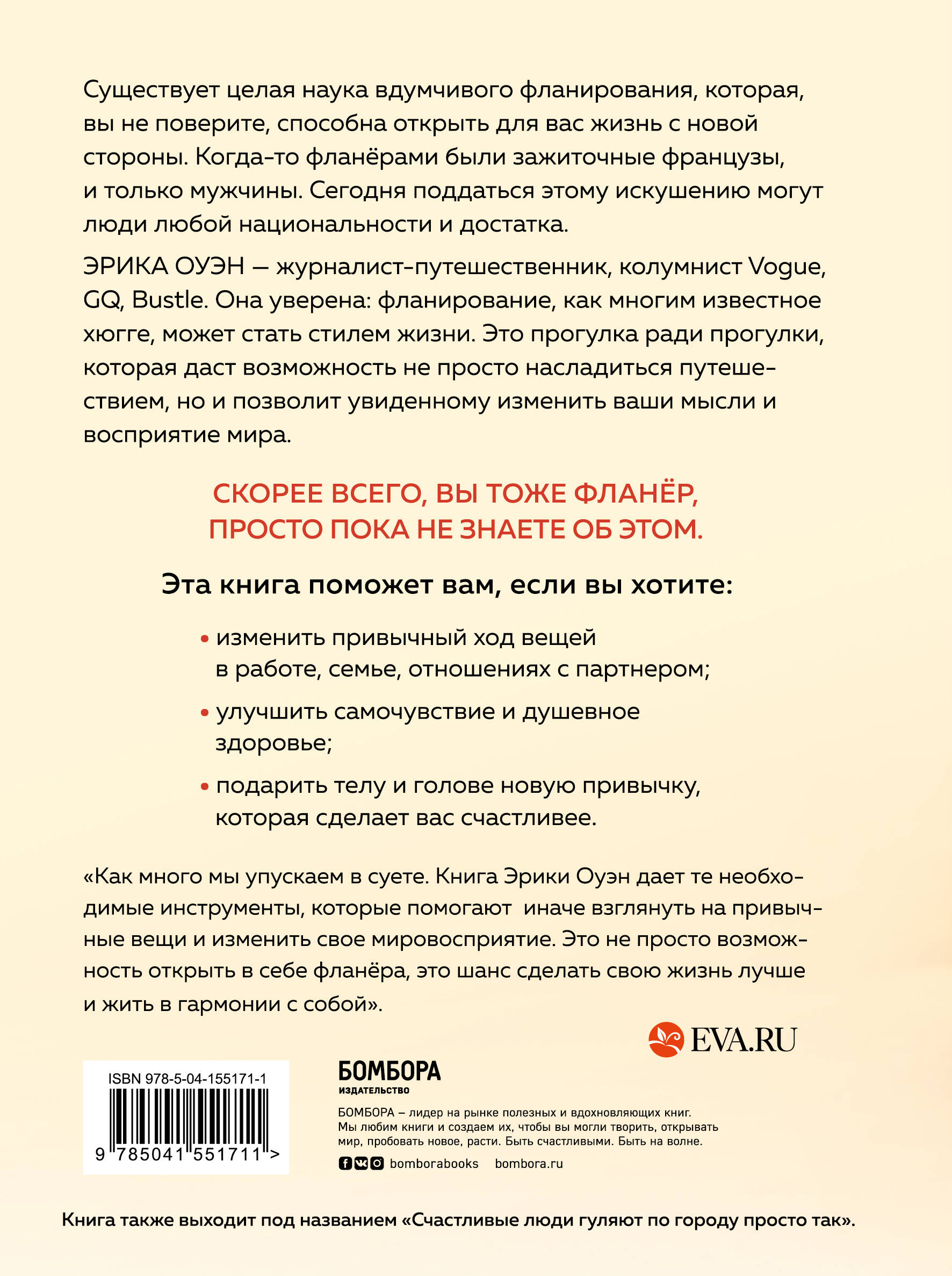 Эрика Оуэн - журналист-путешественник, колумнист Vogue, GQ, Bustle. Она уверена: фланирование, как многим известное хюгге, может стать стилем жизни. Это прогулка ради прогулки, которая даст возможность не просто насладиться путешествием, но и позволит увиденному изменить ваши мысли и восприятие мира. Скорее всего, вы тоже фланер, просто пока не знаете об этом. Эта книга поможет вам, если вы хотите: - Изменить привычный ход вещей в работе, семье, отношениях с партнером. - Улучшить самочувствие и душевное здоровье. - Подарить телу и голове новую привычку, которая сделает вас счастливее.| Издательство | ООО "Издательство "Эксмо" |