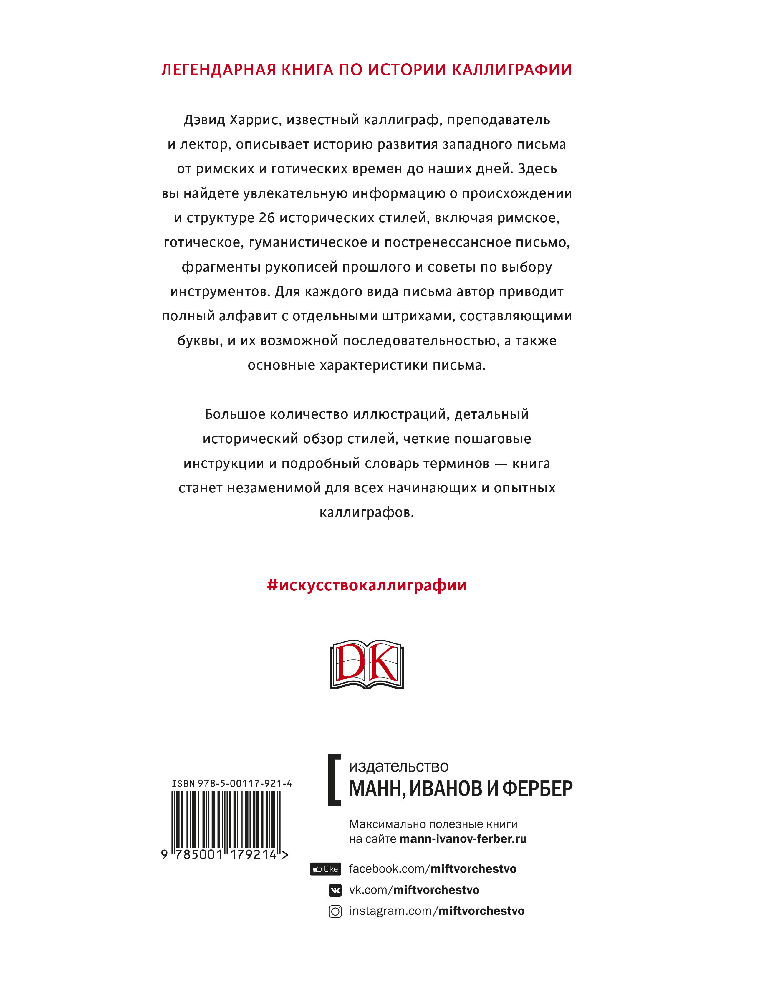 Книга прослеживает историю западной каллиграфии и происхождение стилей, а также предлагает пошаговые инструкции по овладению необходимыми навыками и приемами письма.| Издательство | МАНН, ИВАНОВ И ФЕРБЕР ООО |