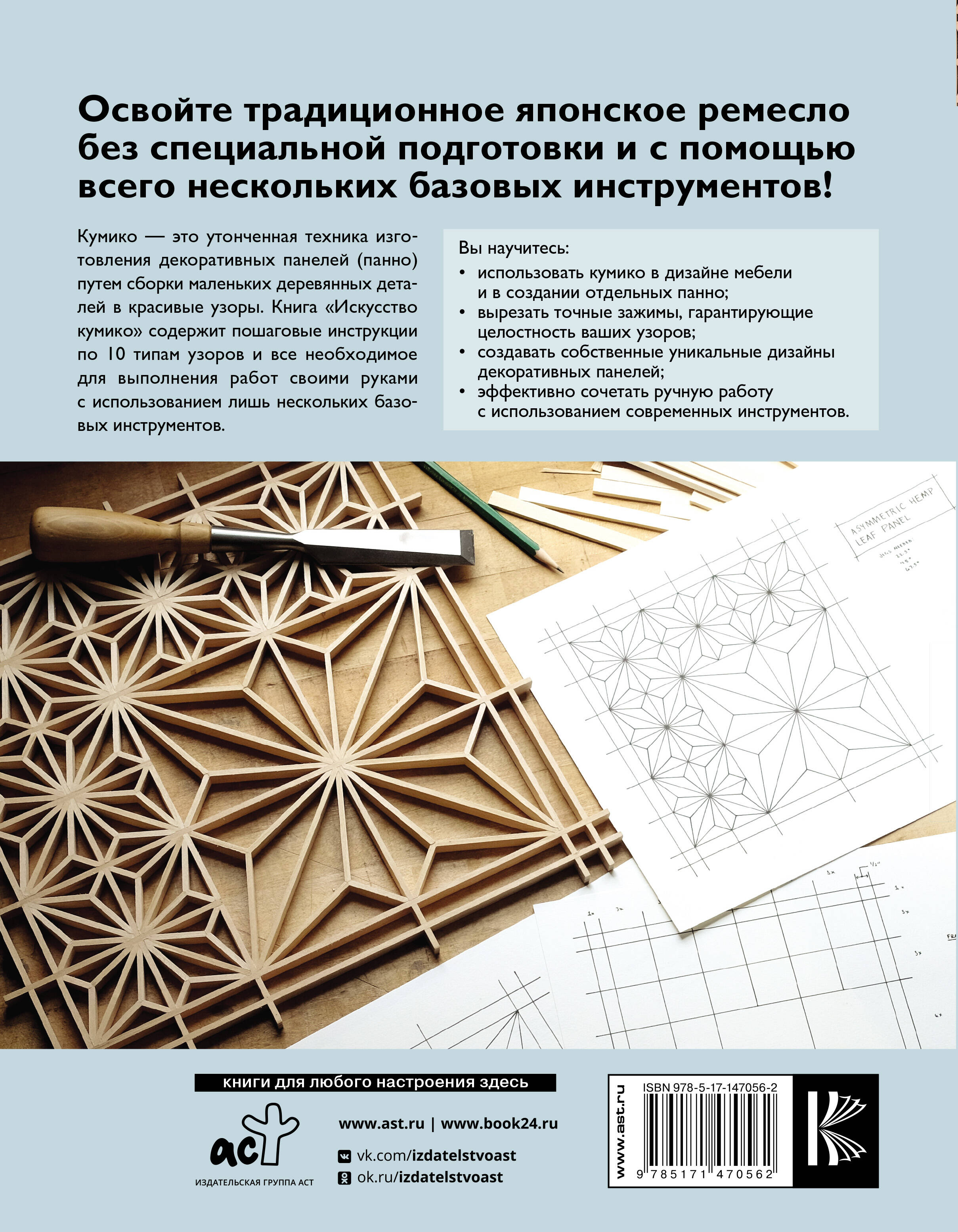 Кумико - это утонченная техника изготовления декоративных панелей (панно) путем сборки маленьких деревянных деталей в красивые узоры. Книга содержит пошаговые инструкции по 10 типам узоров и все необходимое для выполнения работ своими руками с использованием лишь нескольких базовых инструментов. Вы научитесь использовать кумико в дизайне мебели и в создании отдельных панно, вырезать точные зажимы, гарантирующие целостность ваших узоров, создавать собственные уникальные дизайны декоративных панелей, эффективно сочетать ручную работу с использованием современных инструментов.| Издательство | ИЗДАТЕЛЬСТВО "АСТ" |