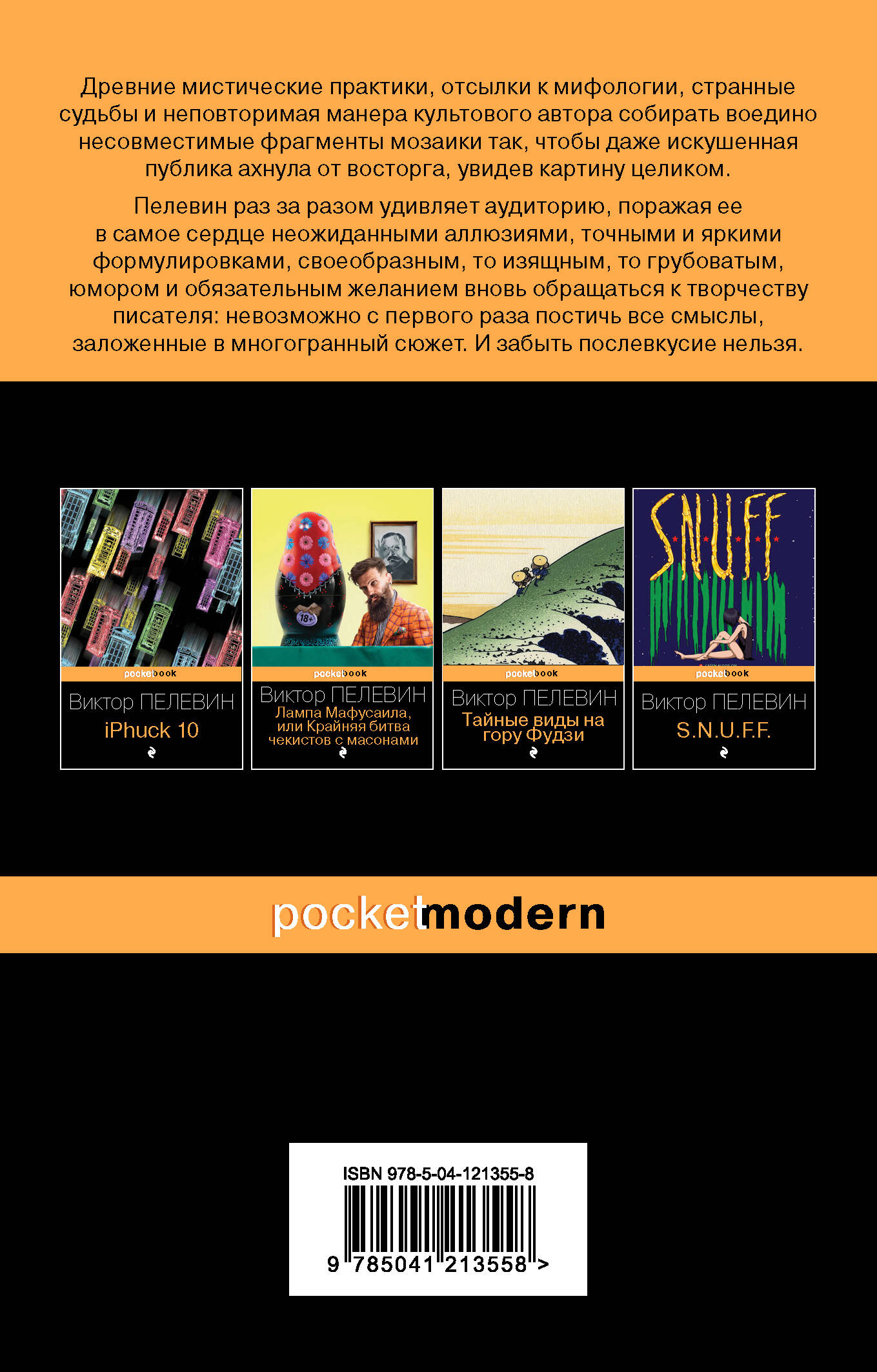 Древние мистические практики, отсылки к мифологии, странные судьбы и неповторимая манера культового автора собирать воедино несовместимые фрагменты мозаики так, чтобы даже искушенная публика ахнула от восторга, увидев картину целиком. Пелевин раз за разом удивляет аудиторию, поражая ее в самое сердце неожиданными аллюзиями, точными и яркими формулировками, своеобразным, то изящным, то грубоватым, юмором и обязательным желанием вновь обращаться к творчеству писателя: невозможно с первого раза постичь все смыслы, заложенные в многогранный сюжет. И забыть послевкусие нельзя.| Издательство | ООО "Издательство "Эксмо" |