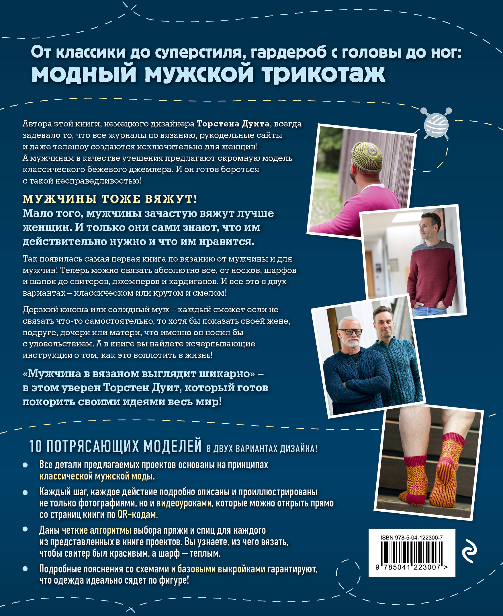 Первое практическое пособие по вязанию на спицах полного мужского гардероба со схемами, выкройками, инструкциями и видеоуроками! У мужчин, как известно, обостренное чувство справедливости. Именно поэтому немецкий мастер вязания и дизайнер трикотажа Торстен Дуит с детства болезненно реагировал на то, что все книги и журналы по вязанию, все сайты в интернете полностью посвящены женским моделям и лишь в качестве утешительного приза где-то в уголке размещен скромный классический бежевый мужской свитер безо всяких изысков и претензий. А с несправедливостью нужно бороться! Так появилась эта необыкновенная книга, в которой дизайнер не только представил 10 великолепных классических моделей носков, шапок, шарфов, джемперов и кардиганов, составляющих мужской гардероб с головы до ног, но и предложил их молодежные, стильные вариации. Кто как не сами мужчины знают, что они хотят носить? Теперь любую вещь из этой блестящей коллекции, созданной мужчиной и для мужчин, может подобрать для себя как модный юноша, так и солидный джентльмен! «Мужчина в вязаном выглядит шикарно!» - так считает Торстен Дуит и надеется видеть все больше и больше людей в красивой вязаной одежде, а в идеале и со спицами в руках. Подробные описания, схемы, выкройки - в этой книге есть все, чтобы воплотить мечту мужчин об идеальном вязаном гардеробе.