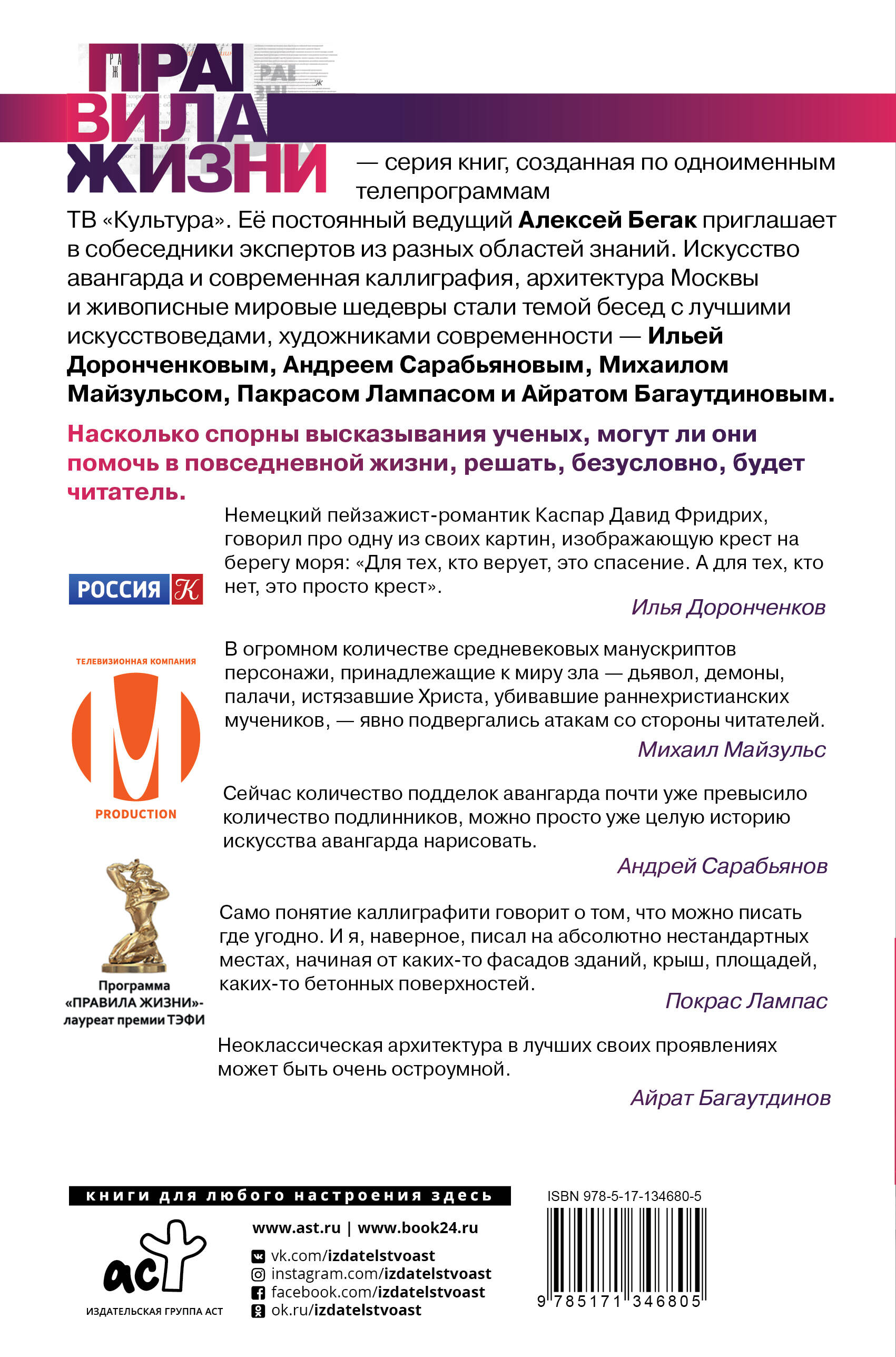Постоянный ведущий программы «Правила жизни» на канале «Культура» Алексей Бегак приглашает в собеседники экспертов из разных областей знаний. В третьей книге одноименной серии Илья Доронченков, Андрей Сарабьянов, Михаил Майзульс, Пакрас Лампас и Айрат Багаутдинов обсуждают искусство авангарда и современную каллиграфию, архитектуру Москвы и живописные мировые шедевры.| Издательство | ИЗДАТЕЛЬСТВО "АСТ" |