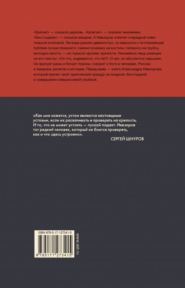 «Еретик!» - сказала церковь. «Хулиган!» - сказали чиновники. «Бесстыдник!» - сказали мещане. А Невзоров ответил очередной язвительной колонкой. Легенда ранних девяностых, он вернулся к почтеннейшей публике лучше прежнего: сменил кожанку на костюм, папиросу на трубку, молодую ярость - на горькую иронию зрелости. Неизменна лишь реакция на его тексты: «Он издевается, что ли?!» О нет, он абсолютно серьезен. Он врачует раны и бичует пороки, говорит о боге и человеке, России и Америке, религии и истории. Перед вами книга Александра Невзорова, который прячет свой трагический прищур за ехидной, бесстыдной и совершенно невыносимой улыбкой.