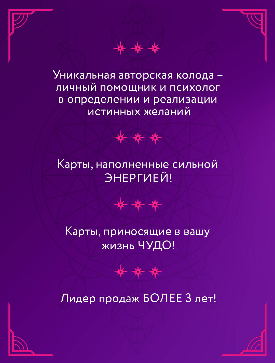 Набор состоит из 52 карт, руководства по работе с колодой и карты желаний. Юлия Столярова - женский тренер и психолог, на блог которой подписано почти полмиллиона человек, автор бестселлера "Ловушка для счастья". Забудьте о психологах, на тренингах которых учат "особым образом загадывать желания" и улыбаться миру в ожидании, что он даст вам все, о чем вы мечтаете. Теперь у вас есть личный психолог и незаменимый помощник - эта колода. Она научит вас, как: получать ответы на самые сложные вопросы; прогнозировать будущее; изменить свое отношение к миру и мира к вам; правильно загадывать желания; действовать так, чтобы мечты сбывались. Мир устроен так, что он не "выдает" готовых мужей, деньги, энергию. Мир дает навигацию и знания - нужно лишь уметь все это взять. Ждать, что вам принесут все на блюдечке с голубой каемочкой, значит навсегда остаться ребенком, который уверен: взрослые решат все проблемы и обеспечат удовольствиями. Но вам-то не пять лет, вы взрослый человек!| Издательство | ИЗДАТЕЛЬСТВО "АСТ" |