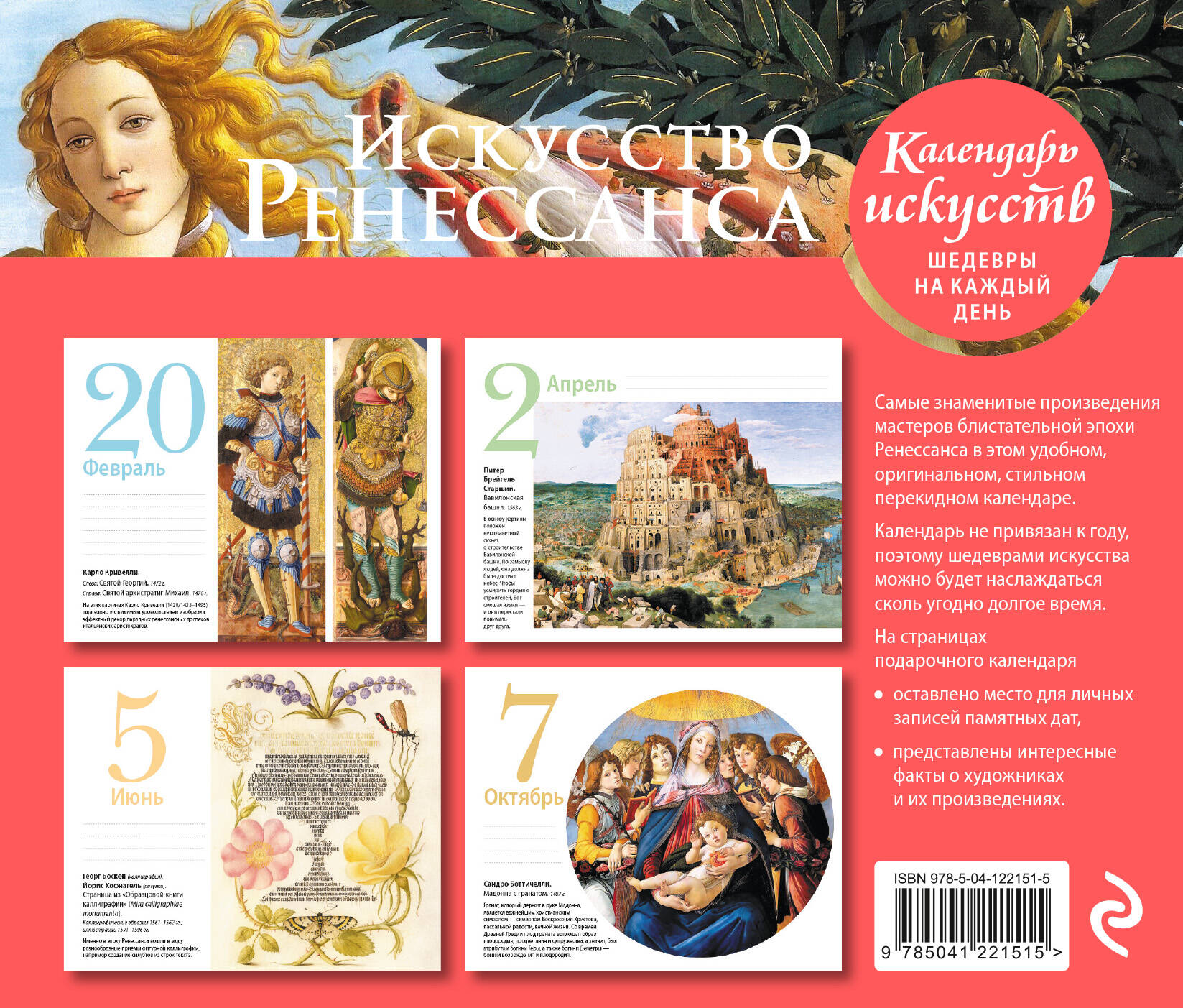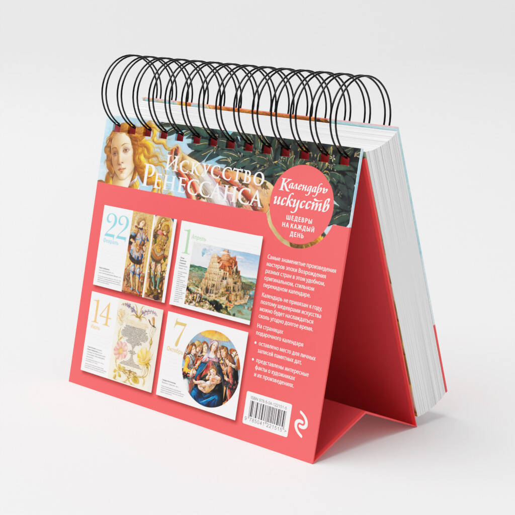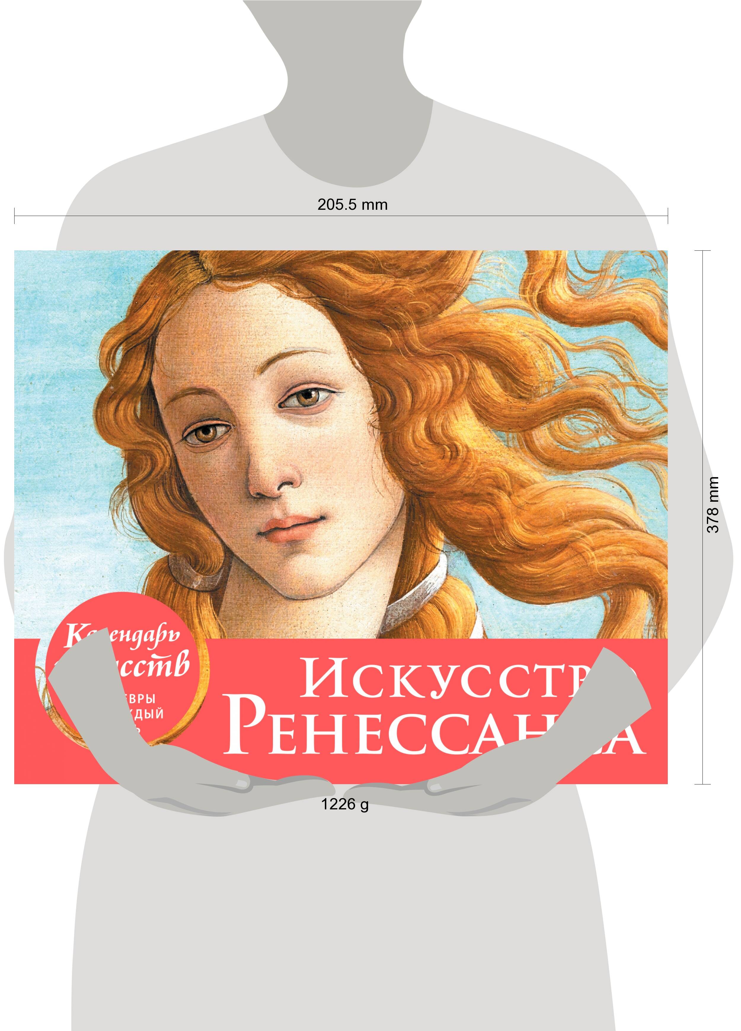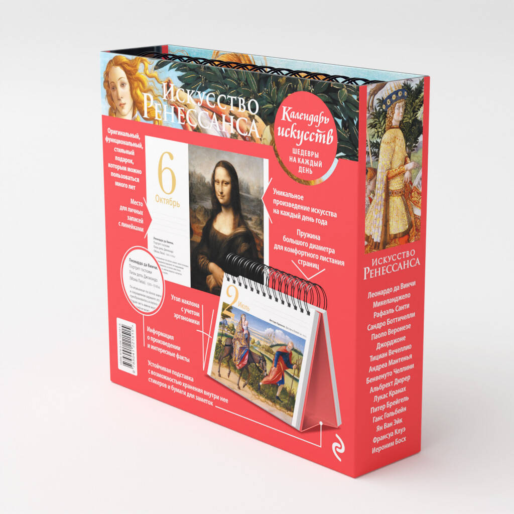 Художники Ренессанса соединили христианскую устремленность к духовности с античным благоговением перед миром земной красоты. Они оставили человечеству непревзойденные образцы вдохновенных художественных произведений и осветили дорогу искусству Европы всех последующих столетий. Вечный календарь «Искусство Ренессанса» из серии «Шедевры на каждый день» - это креативная инновация во Вселенной искусства. Календарь объединяет в себе достоинства художественного альбома, картинной галереи и путеводителя по изобразительному искусству. Яркий, позитивный, оптимистичный - в этом календаре нет ни одной мрачной картины. А это означает, что хорошее настроение вам гарантировано даже в самый сумрачный день. Полезный, стильный, познавательный - как же нам, занятым людям, найти время на разглядывание великих произведений искусства? А как узнать самые интересные подробности, факты и обстоятельства, но без утомительного умствования искусствоведов? Решение - перед вами! Удобство, красота и полезность календаря делают его уникальным презентом «со смыслом». Он станет необычным и знаковым подарком для себя, для подруги или коллеги. Здесь ничего не будет устаревать. Наши текущие заметки, для которых отведено специальное место, придадут календарю функцию ежедневника, а соседство с прошлыми записями напомнит о сделанном и достигнутом. Великолепная полиграфия и нескучная полезная информация позволит ненавязчиво обогатить эстетический кругозор. Эргономичное пружинное крепление гарантирует надежный функционал. Судьбы художников, неизвестные факты об известных картинах, прекрасные полотна и, главное, хорошее настроение на каждый день - все это вы найдете в серии подарочных календарей «Шедевры на каждый день». И пусть утонченный и изысканный дух великих художников вдохновит вас на большие планы и смелые решения. Технологические преимущества: • Оригинальный, функциональный, эстетичный подарок, которым можно пользоваться много лет. • Стильная подарочная коробка. • Уникальное произведение искусства на каждый день года. • Пружина большого диаметра для комфортного перелистывания страниц. • Место для личных записей. • Исчерпывающая информация и интересные факты о каждом произведении. • Устойчивая подставка с возможностью хранения внутри нее стикеров и бумаги для заметок. • Угол наклона подставки выполнен с учетом эргономики для наиболее комфортного восприятия.| Издательство | Эксмо |