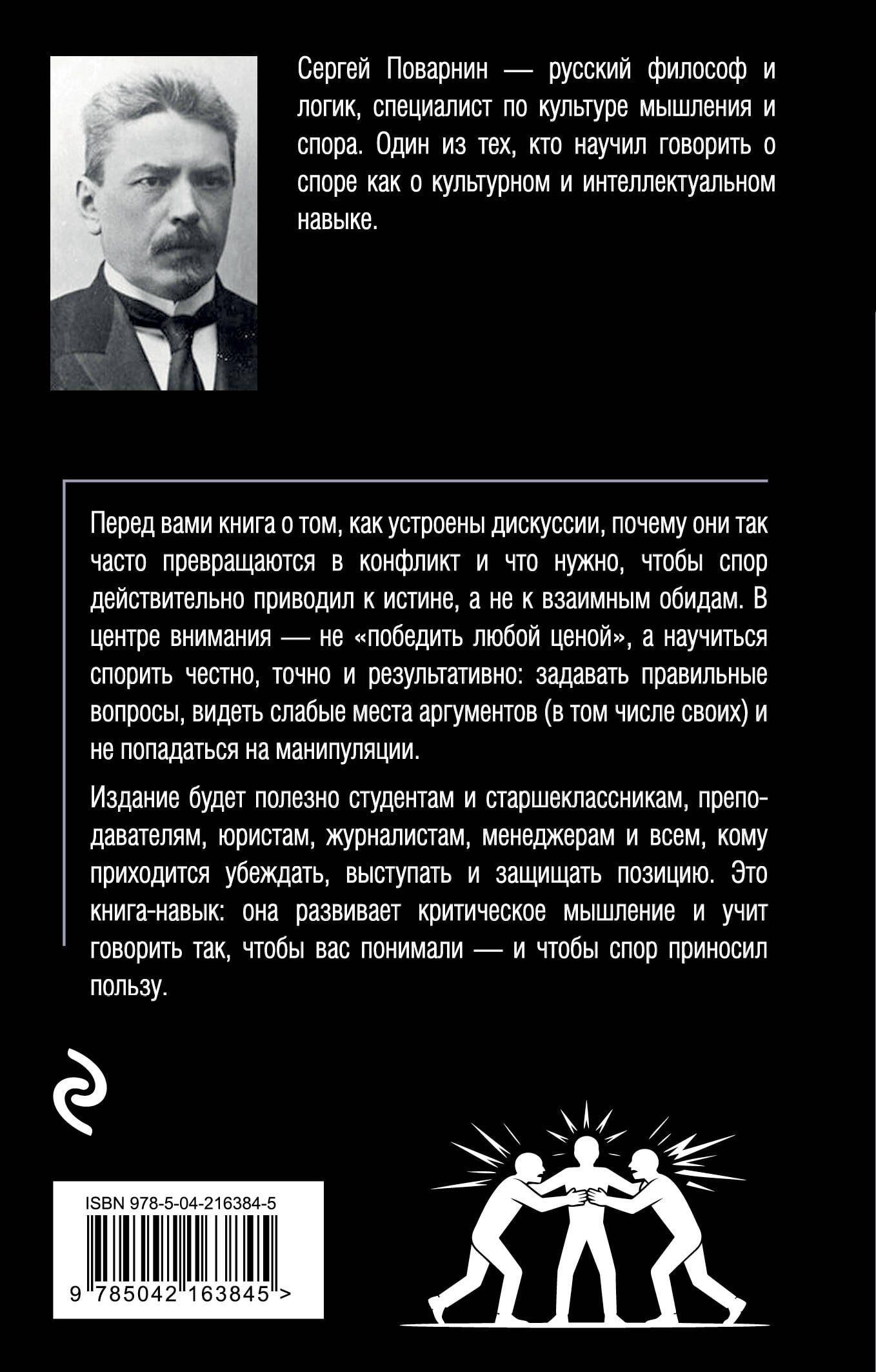 Чем спор отличается от ссоры - и когда спор действительно полезен? Как строить аргументы, чтобы вас понимали и принимали всерьез? Какие ошибки чаще всего рушат даже сильную позицию? «Искусство спора. О теории и практике спора» Сергея Поварнина - классическая книга о том, как спорить умно и честно. Написанная еще в 1918 году, книга удивительно точно описывает то, что происходит в дискуссиях сегодня - от учебных и рабочих обсуждений до публичных дебатов и семейных разговоров. В книге вы найдете ответы на вопросы: - Как распознавать софизмы, ложные доводы и мнимые доказательства - и что отвечать на них? - Как пресекать уловки и манипуляции, не скатываясь в грубость? - Как сочетать логику и психологию, чтобы спор не превращался в конфликт? Книга пригодится школьникам и студентам, преподавателям, юристам, журналистам, менеджерам и всем, кто регулярно обсуждает, доказывает и договаривается. Это практичное чтение, которое помогает говорить точнее, думать яснее и выигрывать спор не шумом, а силой аргумента.| Издательство | ООО "Издательство "Эксмо" |