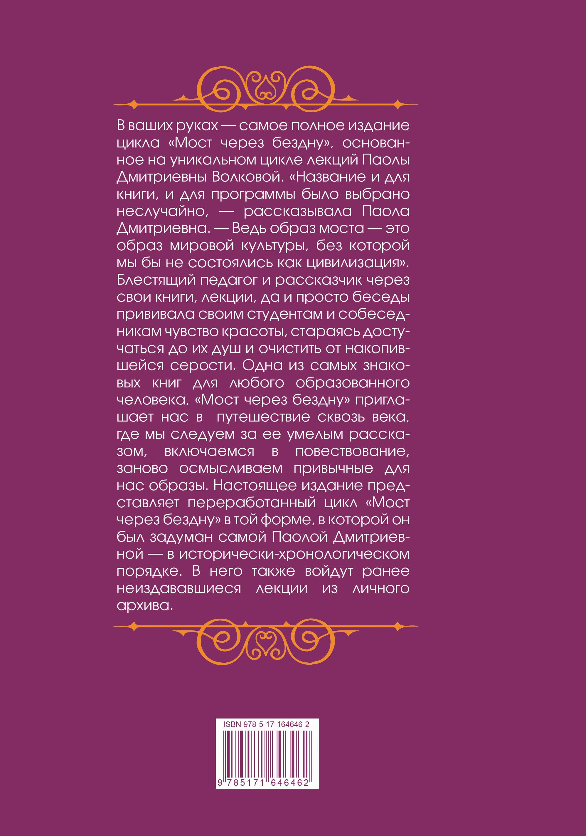 В ваших руках - самое полное издание цикла "Мост через бездну", основанном на уникальном цикле лекций Паолы Дмитриевны Волковой. "Название и для книги, и для программы было выбрано неслучайно, - рассказывала Паола Дмитриевна. - Ведь образ моста - это образ мировой культуры, без которой мы бы не состоялись как цивилизация". Блестящий педагог и рассказчик через свои книги, лекции, да и просто беседы, она прививала своим студентам и собеседникам чувство красоты, стараясь достучаться до их душ и очистить от накопившейся серости. Одна из самых знаковых книг для любого образованного человека, "Мост через бездну" приглашает нас в путешествие сквозь века, где мы следуем за ее умелым рассказом, включаемся в повествование, заново осмысливаем привычные для нас образы. Настоящее издание представляет переработанный цикл "Мост через бездну" в той форме, в которой он был задуман самой Паолой Дмитриевной - в исторически-хронологическом порядке. В него так же войдут ранее неизданные лекции из личного архива.| Издательство | Издательство "АСТ" |