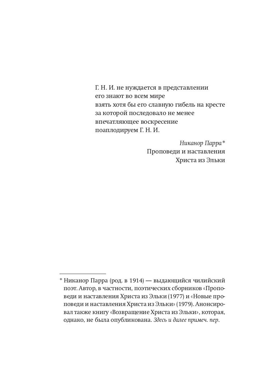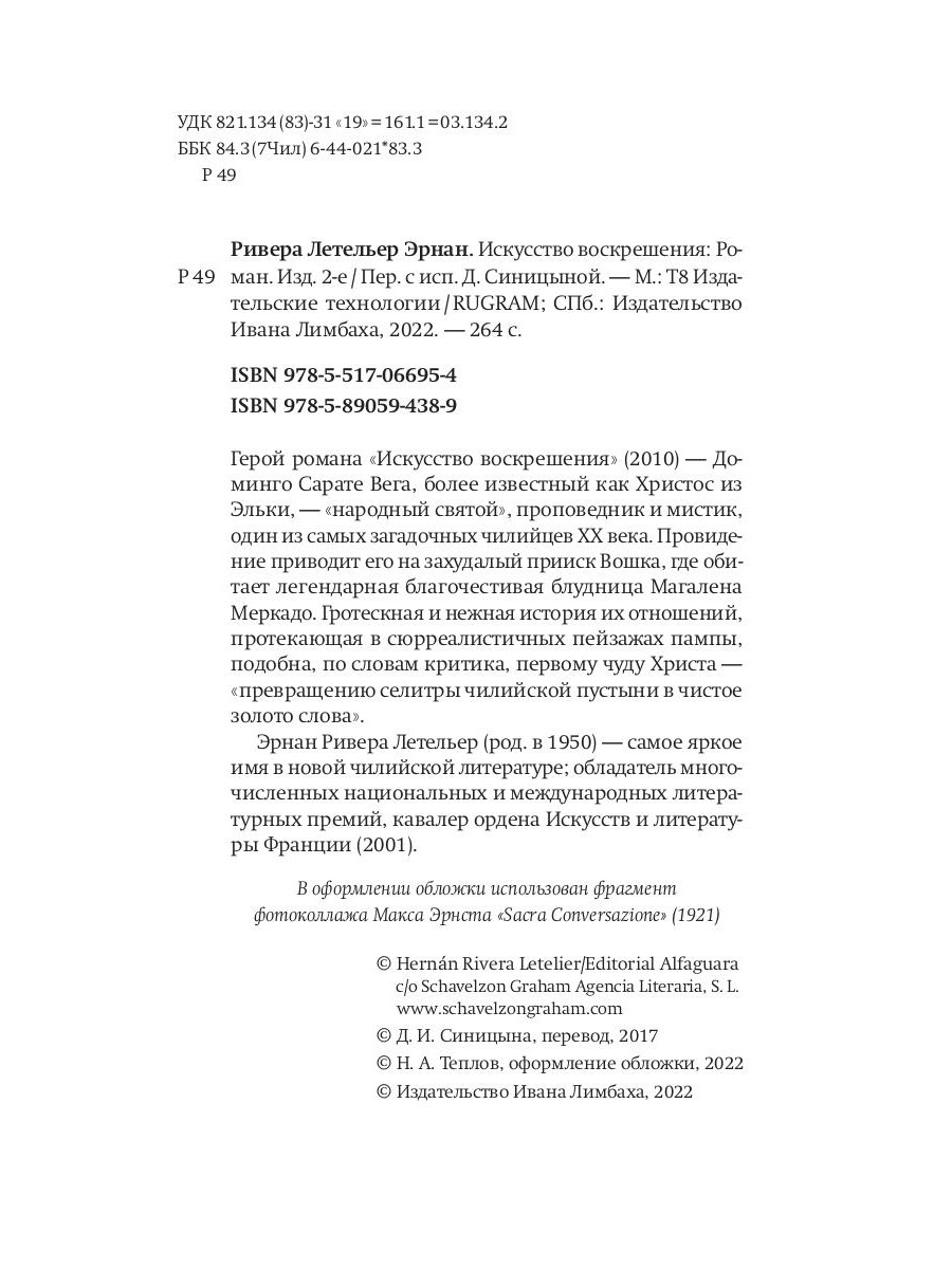 Герой романа «Искусство воскрешения» (2010) - Доминго Сарате Вега, более известный как Христос из Эльки, - «народный святой», проповедник и мистик, один из самых загадочных чилийцев XX века. Провидение приводит его на захудалый прииск Вошка, где обитает легендарная благочестивая блудница Магалена Меркадо. Гротескная и нежная история их отношений, протекающая в сюрреалистичных пейзажах пампы, подобна, по словам критика, первому чуду Христа - «превращению селитры чилийской пустыни в чистое золото слова». Эрнан Ривера Летельер (род. в 1950) - самое яркое имя в новой чилийской литературе; обладатель многочисленных национальных и международных литературных премий, кавалер ордена Искусств и литературы Франции (2001).| Издательство | Т8 RUGRAM |
