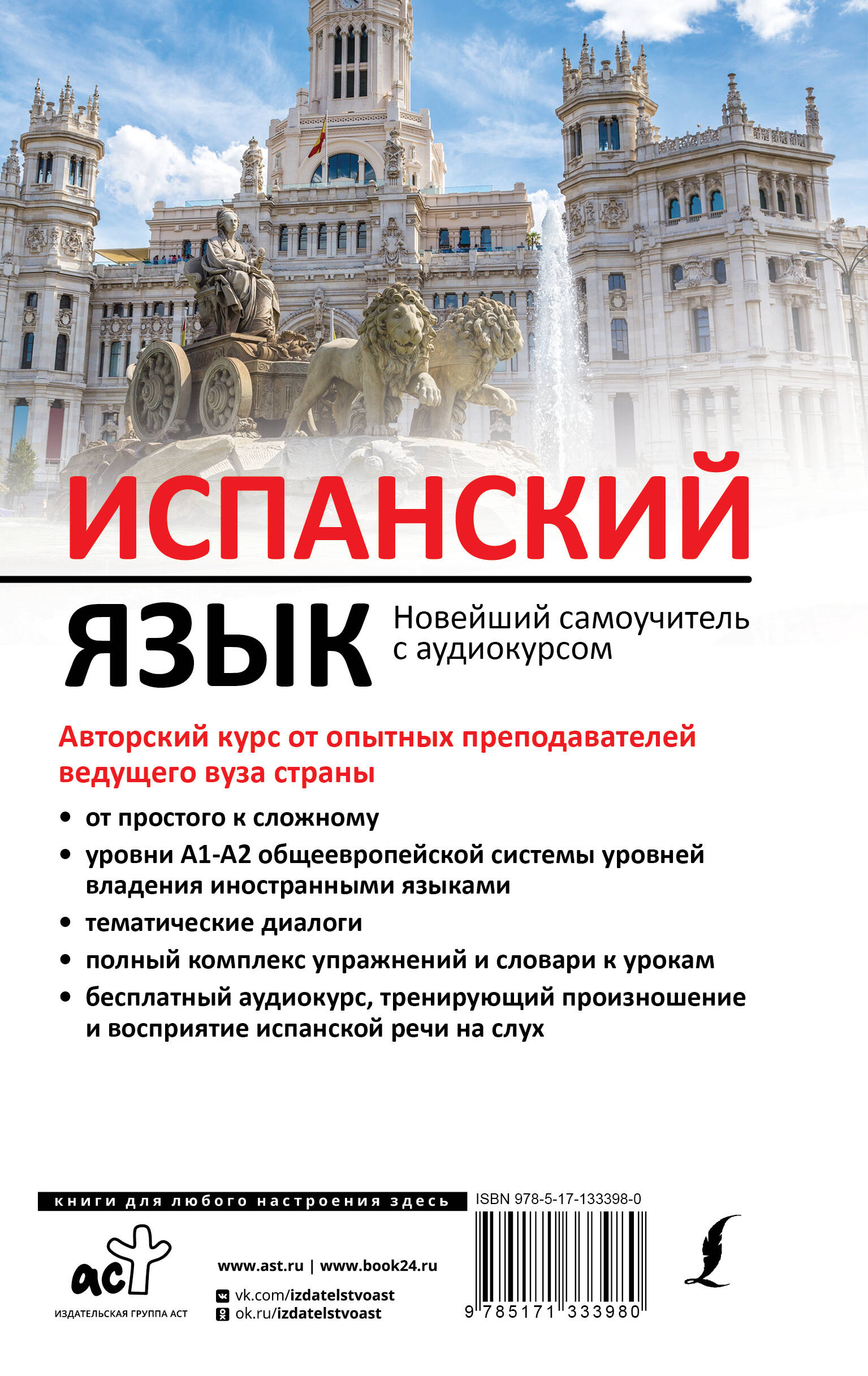 Данный учебник предназначен для всех, кто желает изучать испанский язык и интересуется культурой испаноязычных стран. Курс построен по принципу от простого к сложному и включает 15 уроков. Каждый урок содержит объяснения основных тем базовой грамматики с упражнениями, а также лексический материал и разговорную практику: тематический словарь, тексты и диалоги, упражнения для закрепления материала. Многие диалоги, тексты и упражнения, озвученные носителями языка, совершенно бесплатно доступны для прослушивания на официальном сайте издательства АСТ в разделе "Аудио". В приложение вынесены таблицы спряжения отклоняющихся и неправильных глаголов, список порядковых числительных и другие полезные материалы. В этом пособии вы найдете необходимый объем испанской грамматики и лексики, соответствующий уровням А1-А2 языковой компетенции общеевропейской системы уровней владения иностранным языком. Книга может быть использована как на занятиях в языковых и неязыковых вузах, школах, гимназиях, на языковых курсах, так и для самостоятельного изучения испанского языка.| Издательство | ИЗДАТЕЛЬСТВО "АСТ" |