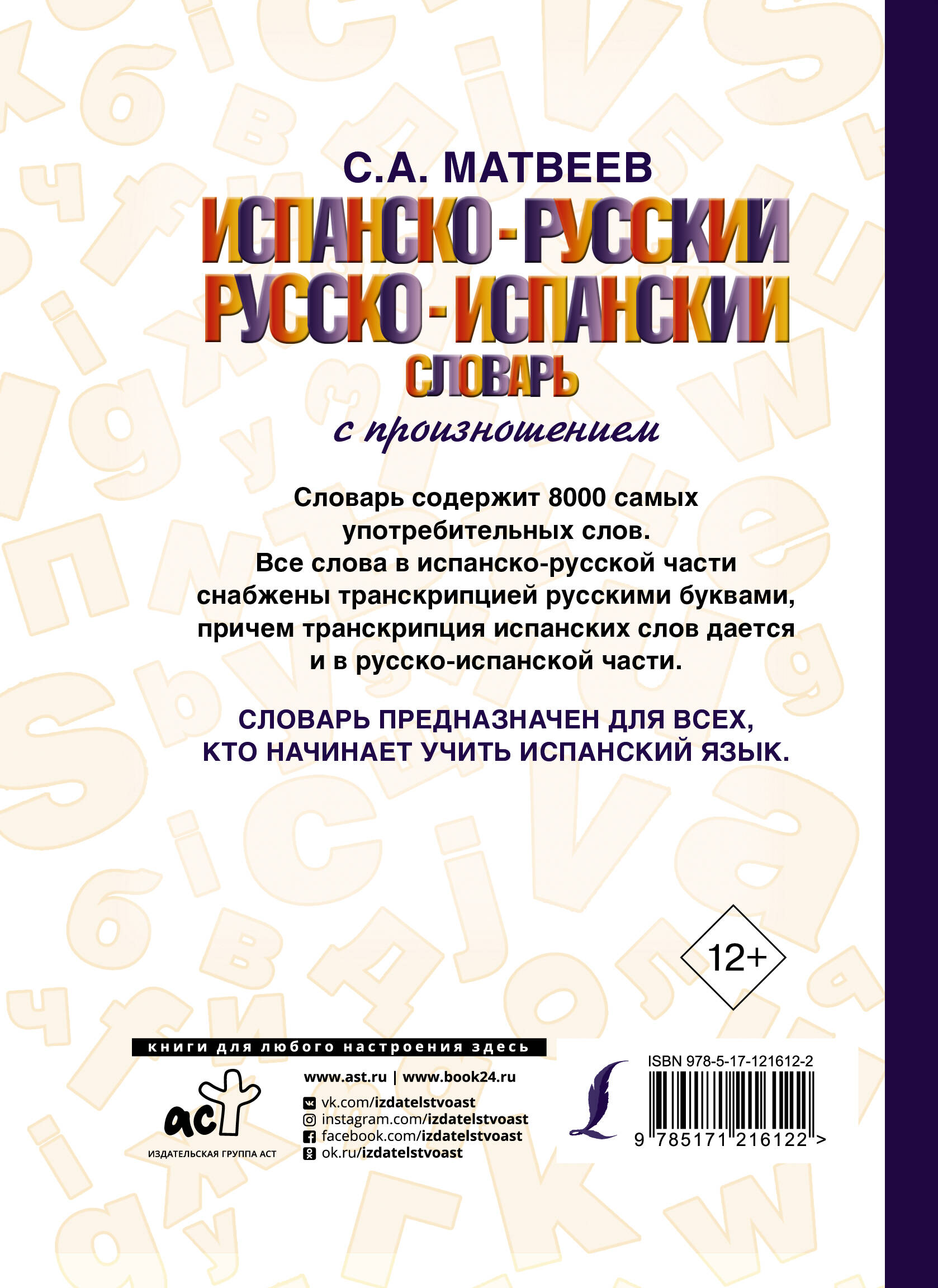 Этот словарь подготовлен автором популярных самоучителей и учебных пособий Сергеем Матвеевым. Испанско-русская и русско-испанская части содержат примерно по 4000 наиболее употребительных слов. Все слова снабжены транскрипцией русскими буквами, причем и в русско-испанской части также дается произношение испанских слов. Издание дополнено полезными приложениями, которые пригодятся в процессе обучения. Словарь предназначен для всех, кто начинает изучать испанский язык, и может быть использован на занятиях с преподавателем или при самостоятельном изучении.| Издательство | Издательство "АСТ" |
