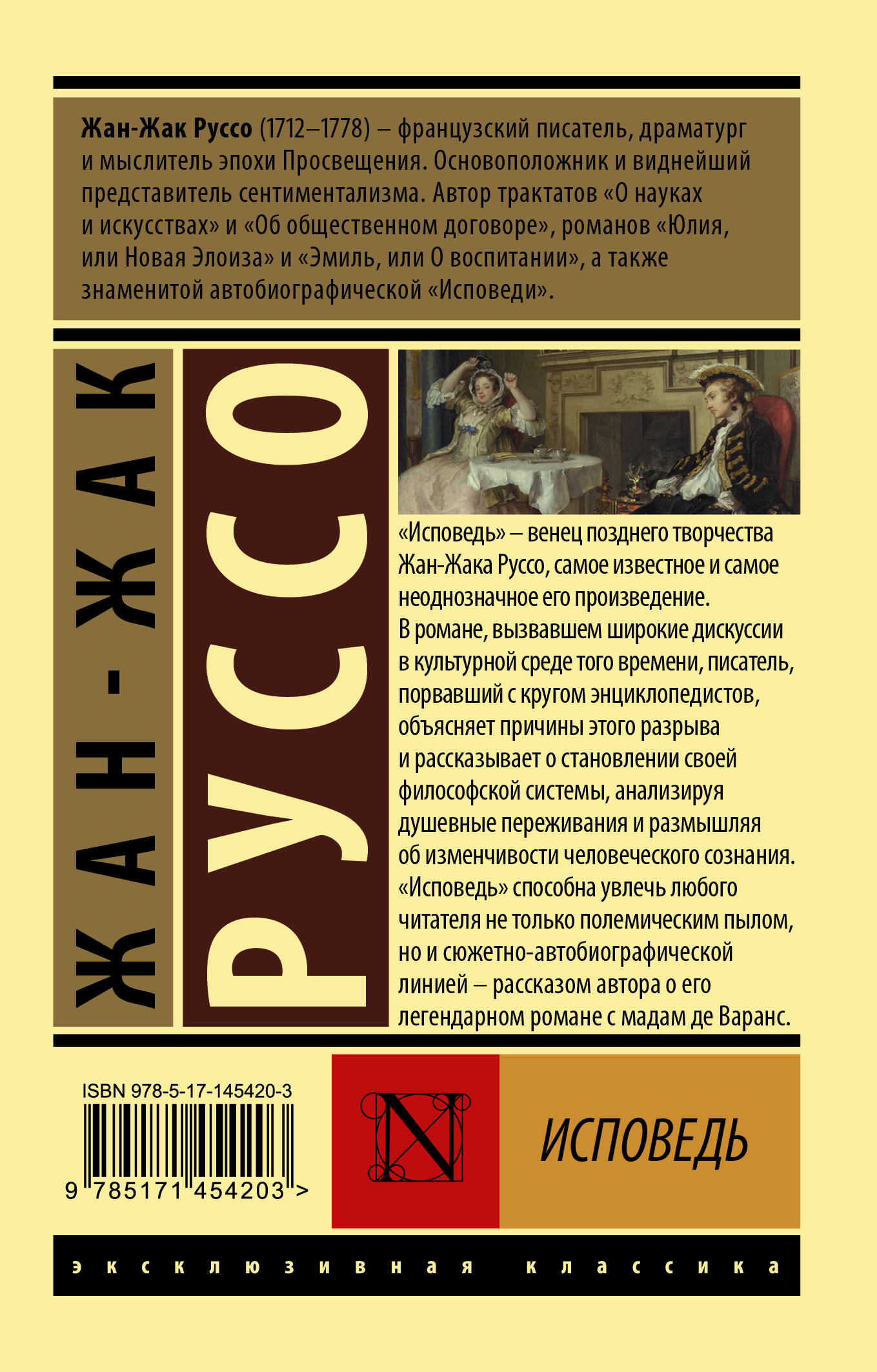 "Исповедь" - венец позднего творчества Жан-Жака Руссо, самое известное и самое неоднозначное его произведение. В романе, вызвавшем широкие дискуссии в культурной среде того времени, писатель, порвавший с кругом энциклопедистов, объясняет причины этого разрыва и рассказывает о становлении своей философской системы, анализируя душенные переживания и размышляя об изменчивости человеческого сознания. "Исповедь" способна увлечь любого читателя не только полемическим пылом, но и сюжетно-автобиографической линией - рассказом автора о его легендарном романе с мадам де Варанс.| Издательство | ИЗДАТЕЛЬСТВО "АСТ" |