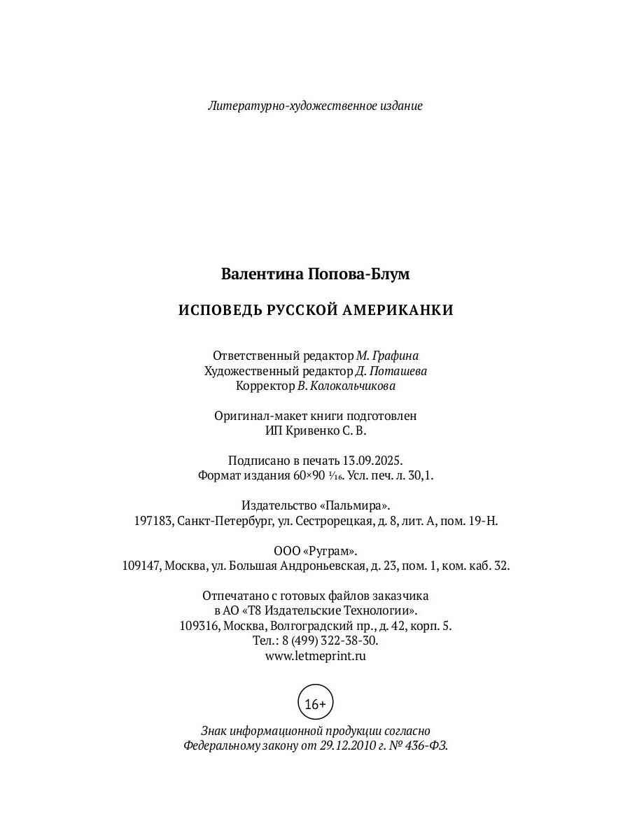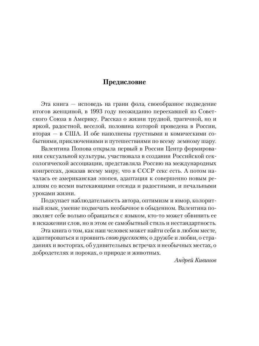 «Исповедь русской американки» - история яркой и беспокойной судьбы Валентины Поповой-Блум, рассказанная ею самой с удивительной откровенностью. В Москве она бросила вызов табу, открыв первое в СССР эротическое кафе и первый секс-шоп, создав Центр психологической помощи подросткам, участвуя в легендарных теледебатах... Ее жизнь резко изменилась с переездом в Америку, где «энергичное и трагичное» прошлое сменилось «феерическим, но беспокойным» будущим. С иронией и трепетом автор наблюдает контрасты двух миров: от встречи с первым мужем до восторгов перед оперой в «Метрополитен», где рождалась новая страсть. Ее проза - смесь ностальгии и любопытства, исследование утрат и обретений на пути познания себя. Откровенная, дерзкая и жизнеутверждающая хроника разлома эпох, рассказанная одной из самых неординарных его свидетельниц.| Издательство | Т8 RUGRAM |