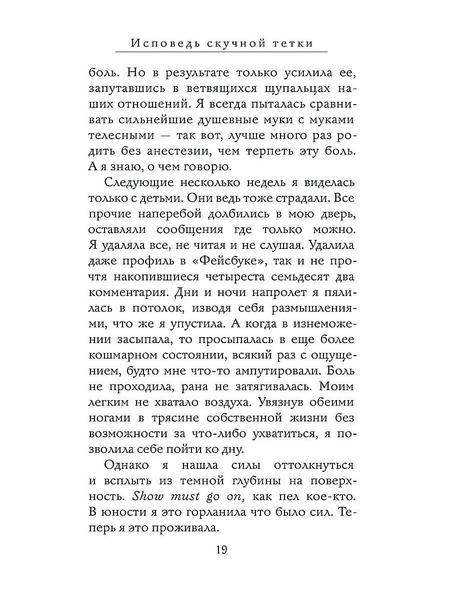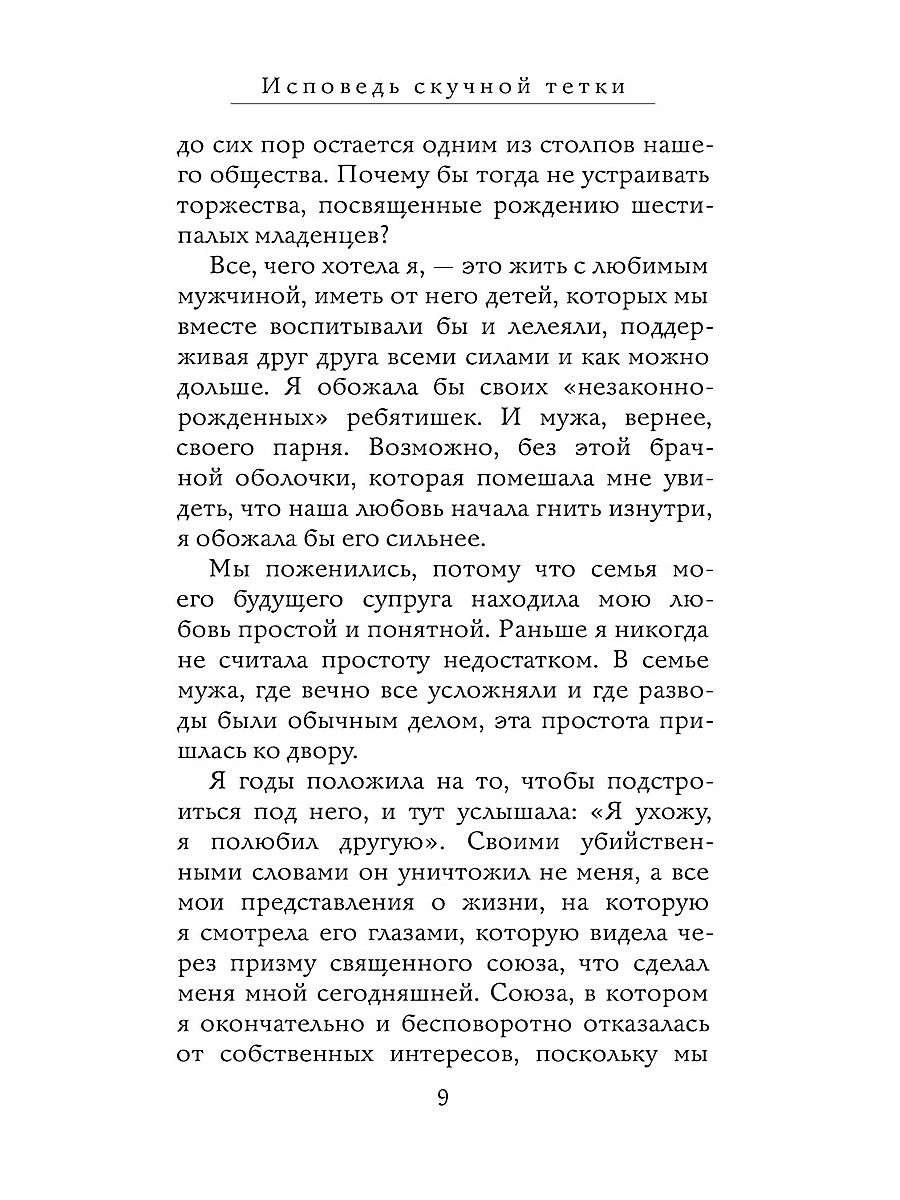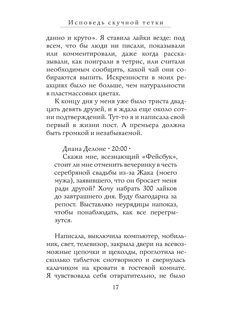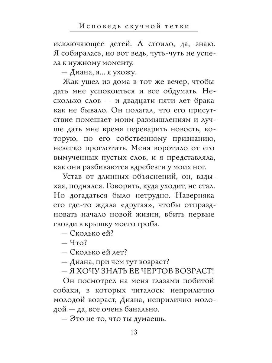 Я ухожу. Я полюбил другую. По статистике, так заканчивается большинство браков. Но статистика не утешает, когда сердце твое разбито, а впереди - неизвестность. Диане 48, и вместо празднования серебряной свадьбы ей предстоит начать жизнь заново. В этой новой жизни она разломает полдома, заведет кота, купит беговые кроссовки, попадет в десяток нелепых историй, потеряет и снова найдет себя. Главное, что есть подруги, дети и вино, а силы жить дальше появятся. «Исповедь скучной тетки» - это честная, горькая и смешная история обретения себя, которая понравится поклонницам Бриджит Джонс и Анны Гавальды.| Издательство | Дом историй |