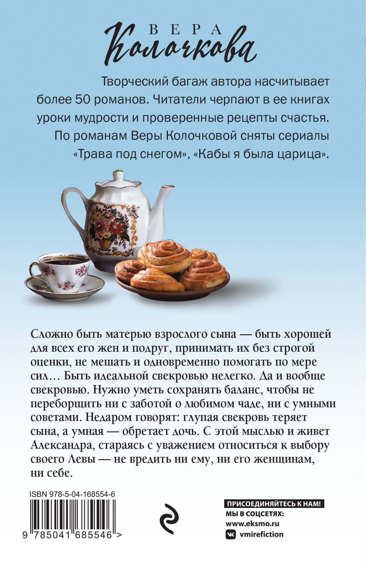 Библиография Веры Колочковой насчитывает более 40 романов, многие из которых уже воплощены на экране. Любовь к автору вполне объяснима, ведь она пишет об обычных людях, которые стремятся к лучшей жизни и борются за собственное счастье. Простые и чувственные, увлекательные и романтичные, романы Колочковой задевают за живое, заставляя сопереживать и радоваться героям как своим знакомым. Сложно быть матерью взрослого сына. Сложно быть хорошей для всех его жен и подруг - принимать их без строгой оценки, не мешать и одновременно помогать по мере сил. И вообще, нелегко быть идеальной свекровью. Да и просто свекровью… Нужно уметь сохранять баланс, чтобы не переборщить ни с заботой, ни с помощью любимому чаду, ни с умными советами. Ведь недаром говорят: глупая свекровь теряет сына, а умная - обретает дочь. С этой мыслью и живет Александра, стараясь с уважением относиться к выбору своего Лёвы - не вредить ни ему, ни его женщинам, ни себе.| Издательство | ООО "Издательство "Эксмо" |