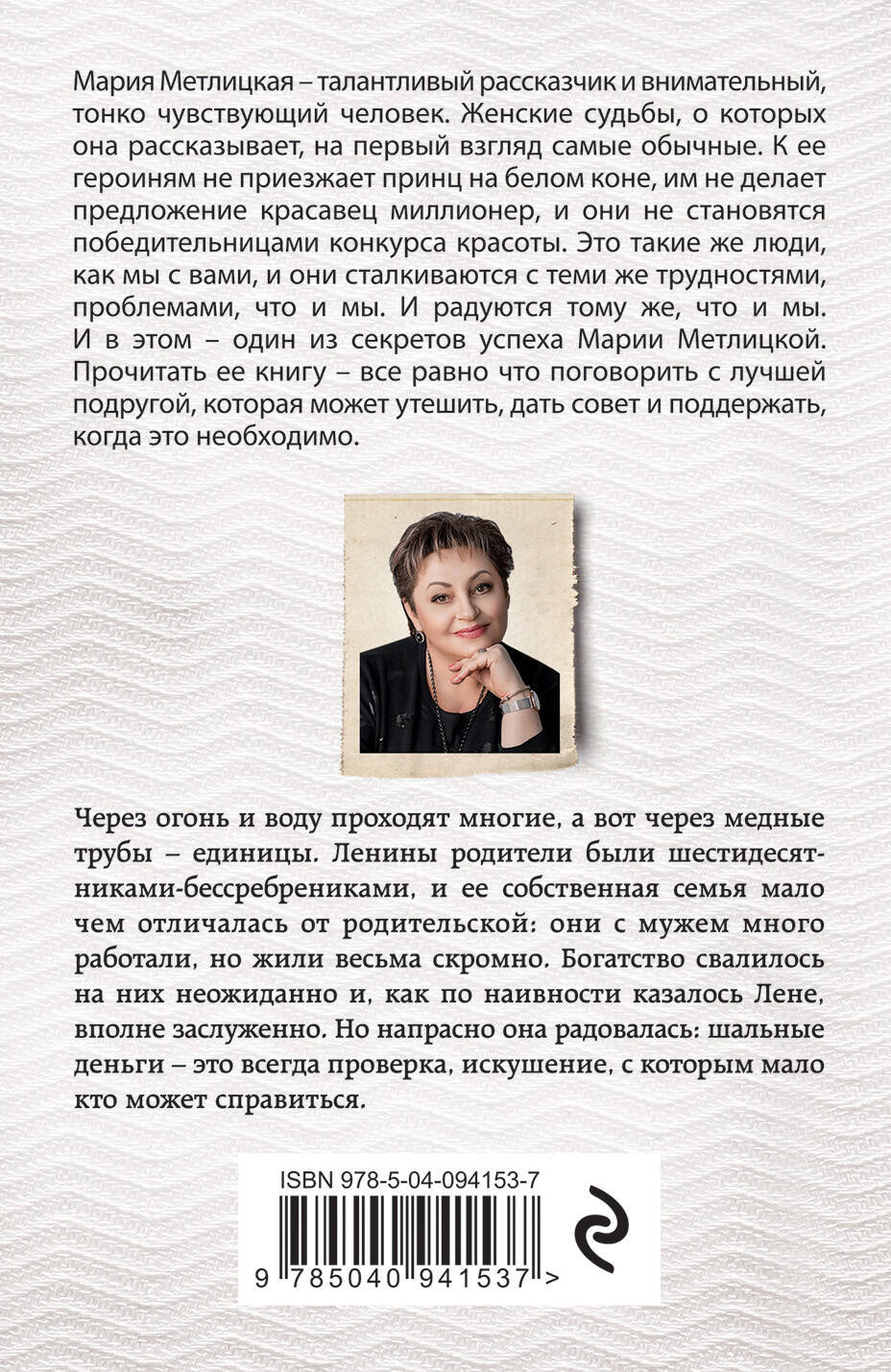 Бестселлер Марии Метлицкой, книга, которая уже много лет остается любимой десятками тысяч читателей. Необычная история - об искушении, предательстве и опыте, который приходит путем ошибок. Через огонь и воду проходят многие, а вот через медные трубы - единицы. Ленины родители были шестидесятниками-бессребрениками, и ее собственная семья мало чем отличалась от родительской: они с мужем много работали, но жили весьма скромно. Богатство свалилось на них неожиданно и, как по наивности казалось Лене, вполне заслуженно. Но напрасно она радовалась: шальные деньги - это всегда проверка, искушение, с которым мало кто может справиться.