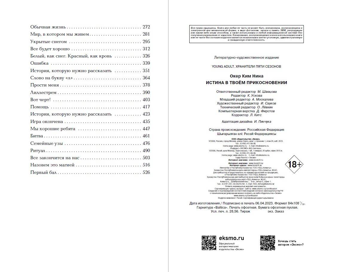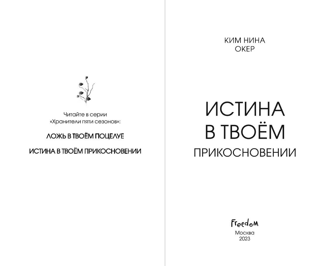 «Истина в твоём прикосновении» Ким Нина Окер - продолжение романтического фэнтези «Ложь в твоём поцелуе»! Нежная история любви, рассказывающая о двух временах года, борьбе и противостоянии, магии тьмы и света. Давным-давно боги управляли сменой времен года, но оставили землю и избрали четыре семьи, каждая из которых отвечает за свой сезон. С незапамятной поры существовал и пятый сезон, который стал легендой… Все вокруг Блум распадается на части. После нападения на Зимний двор девушка оказывается в плену у собственной семьи, а любимый предает ее. Теперь хранители готовы сделать все, чтобы предотвратить появление Ванитас - пятого сезона. Повстанцы нарушили равновесие, украли амулет времен года и Зимний кристалл, необходимый для смены сезонов. В результате зима окутала мир смертоносной пеленой. Если мятежники победят - Ванитас возродится. Кто проведет ритуал перехода времен года, когда Блум окажется на грани жизни и смерти, а мир будет на пороге хаоса? Идеальная находка для фанатов Эль Косимано! «Роман покорил меня с первой страницы, и я не могла оторваться. История интересная и захватывающая. Мне понравилось, как автор раскрыла тему времен года, ведь каждый сезон был описан детально, тем самым погружая читателя в особую атмосферу». - Amazon| Издательство | ООО "Издательство "Эксмо" |
