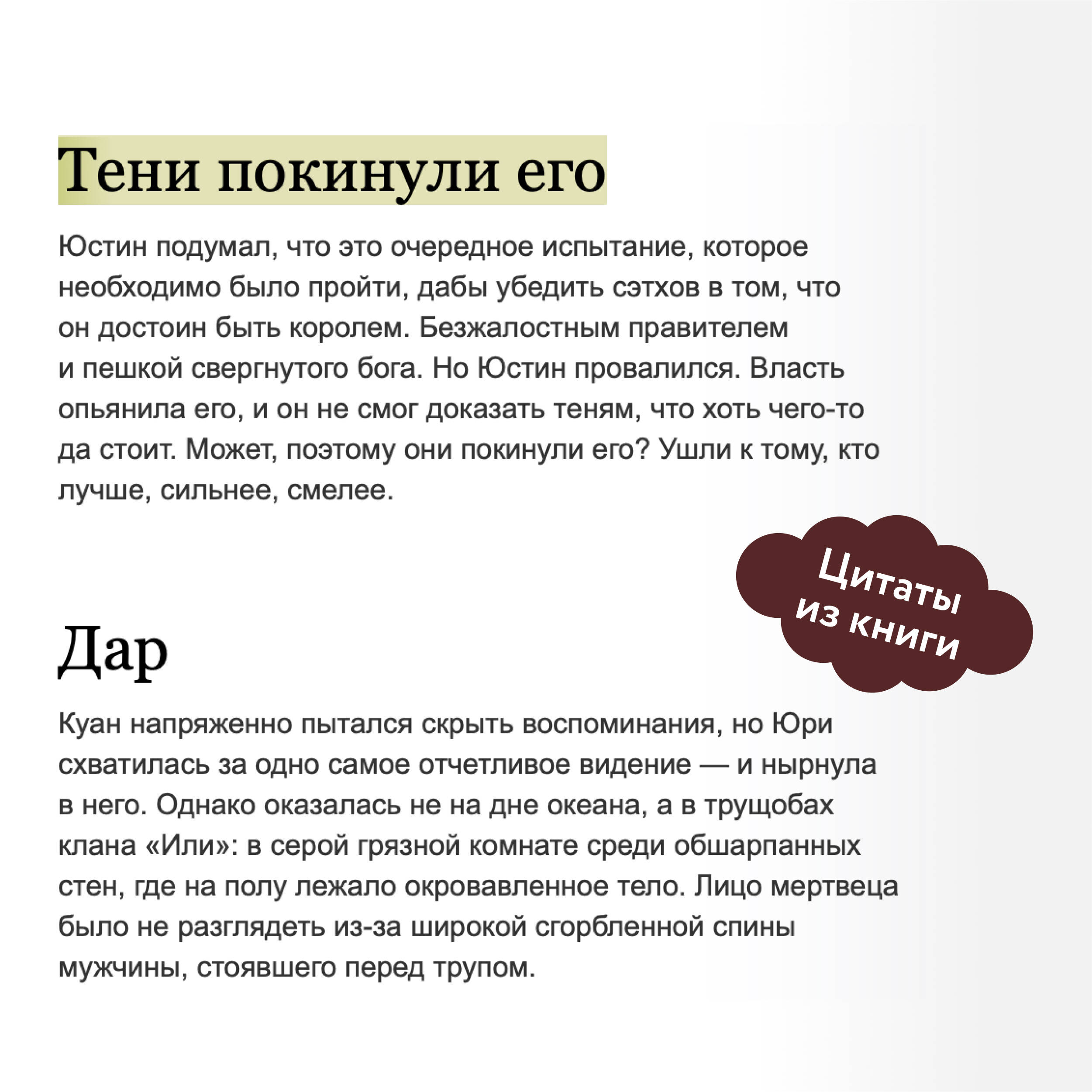 Продолжение стильного темного фэнтези "Пир теней" и "Пророчество тьмы", завершающая часть трилогии. Близится день возмездия. День, когда сбудется пророчество и души, спрятанные в драгоценных камнях, вырвутся на свободу. Пока Юстин томится в темнице Эверока, ожидая казни, Далия, Эвон, Юриэль и Соно должны сделать решающий шаг. Чтобы воскресить святых, им предстоит украсть жемчуг из короны императора и найти сапфир среди бескрайних песков пустыни. Довериться змеям, охраняющим людские кости, и победить саму смерть. Откроется ли путникам истина? И смогут ли они противостоять пугающей тьме?.. Для кого эта книга: Для тех, кто ждет продолжения "Пира теней" и "Пророчества тьмы". Для поклонников темного и стильного фэнтези. Для тех кто любит авторскую мифологию, мрачную атмосферу, сделки с древними богами и опасные приключения.| Издательство | МАНН, ИВАНОВ И ФЕРБЕР ООО |