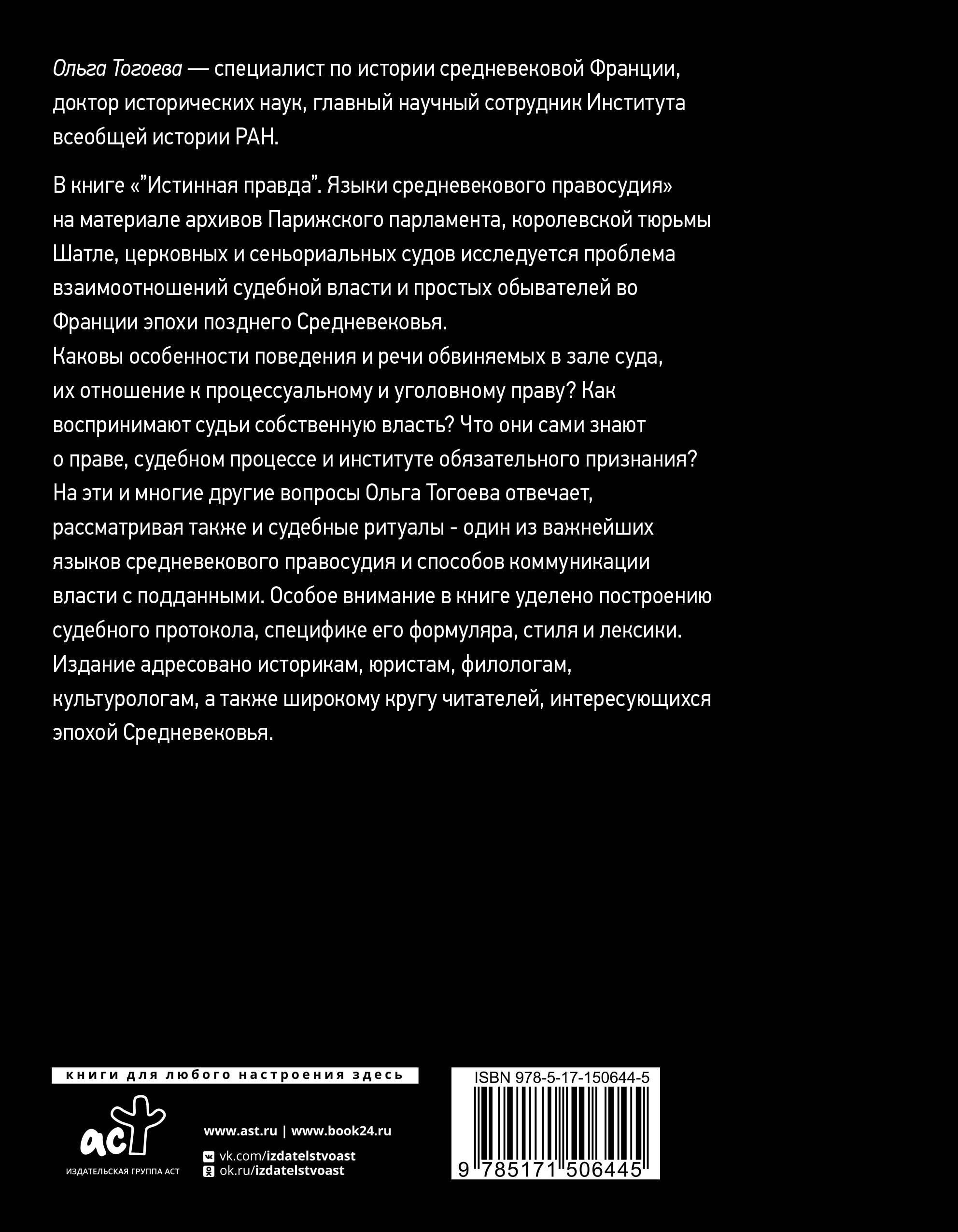 «Истинная правда. Языки средневекового правосудия» - книга, в которой суд рассматривается не как государственный институт, но как место встречи представителей власти с ее подданными. Главной таким образом становится проблема коммуникации, контакта этих двух сил, их способность говорить друг с другом, обмениваться информацией. Как проходил подобный контакт? Как, на каком языке общались судьи и обвиняемые? Что они хотели сказать друг другу? Какими словами, посредством каких понятий и аналогий, при помощи каких жестов каждый из них пытался убедить окружающих в своей правоте? На эти и многие другие вопросы вы найдете ответы в настоящем издании.| Издательство | АСТ |
