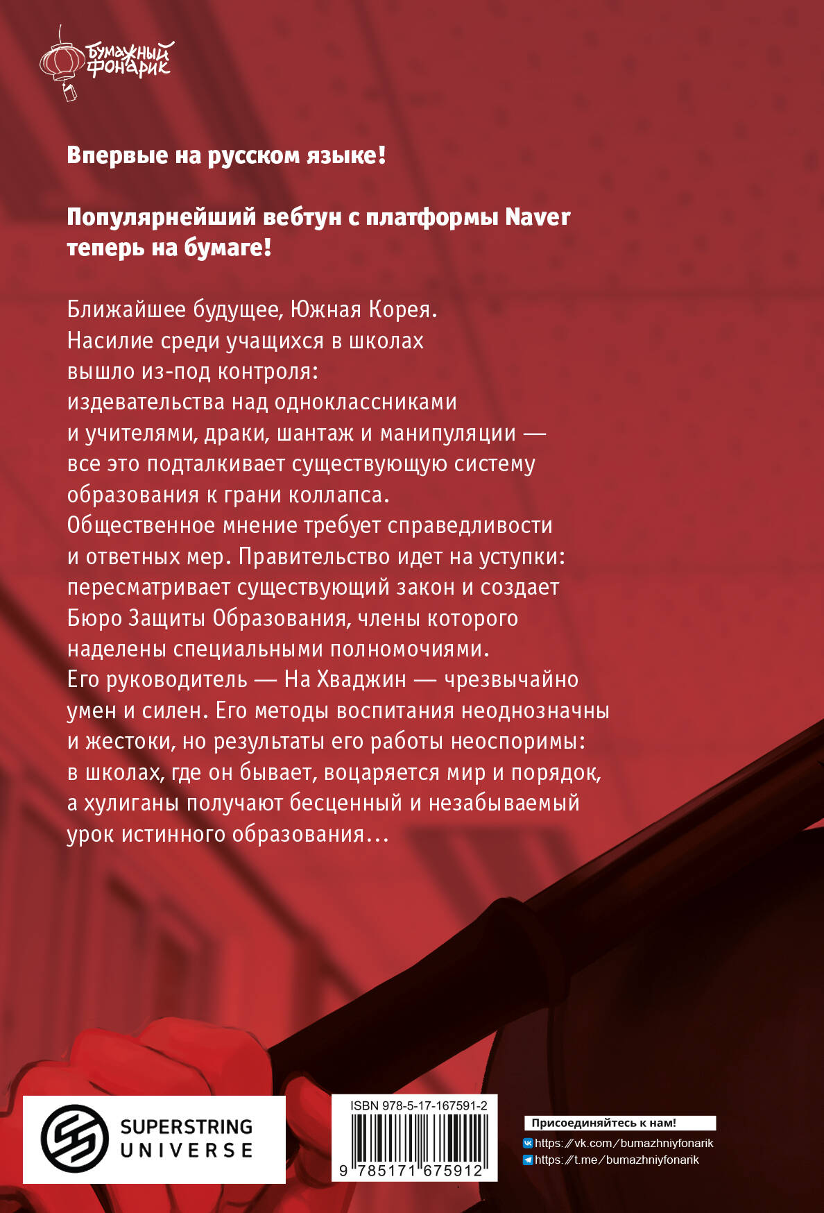 Впервые на русском языке популярнейший вебтун с платформы Naver! В Корее назрела серьезная проблема: насилие среди школьников выходит из-под контроля и от него страдают как учителя, так и другие учащиеся. Министерство образования, чувствуя кризис в существующей системе, создает специальное Бюро Защиты Образования, члены которого наделены специальными полномочиями: иными словами они могут использовать любые средства для того, чтобы вернуть порядок в школах. Капитан На Хваджин становится во главе Бюро. Его методы многим кажутся жестокими, но на самом деле они крайне эффективны, ведь с их помощью даже в самых неблагополучных школах устанавливается мир, а самые худшие хулиганы получают бесценный урок и осознают, что такое истинное образование. Для широкого круга читателей.