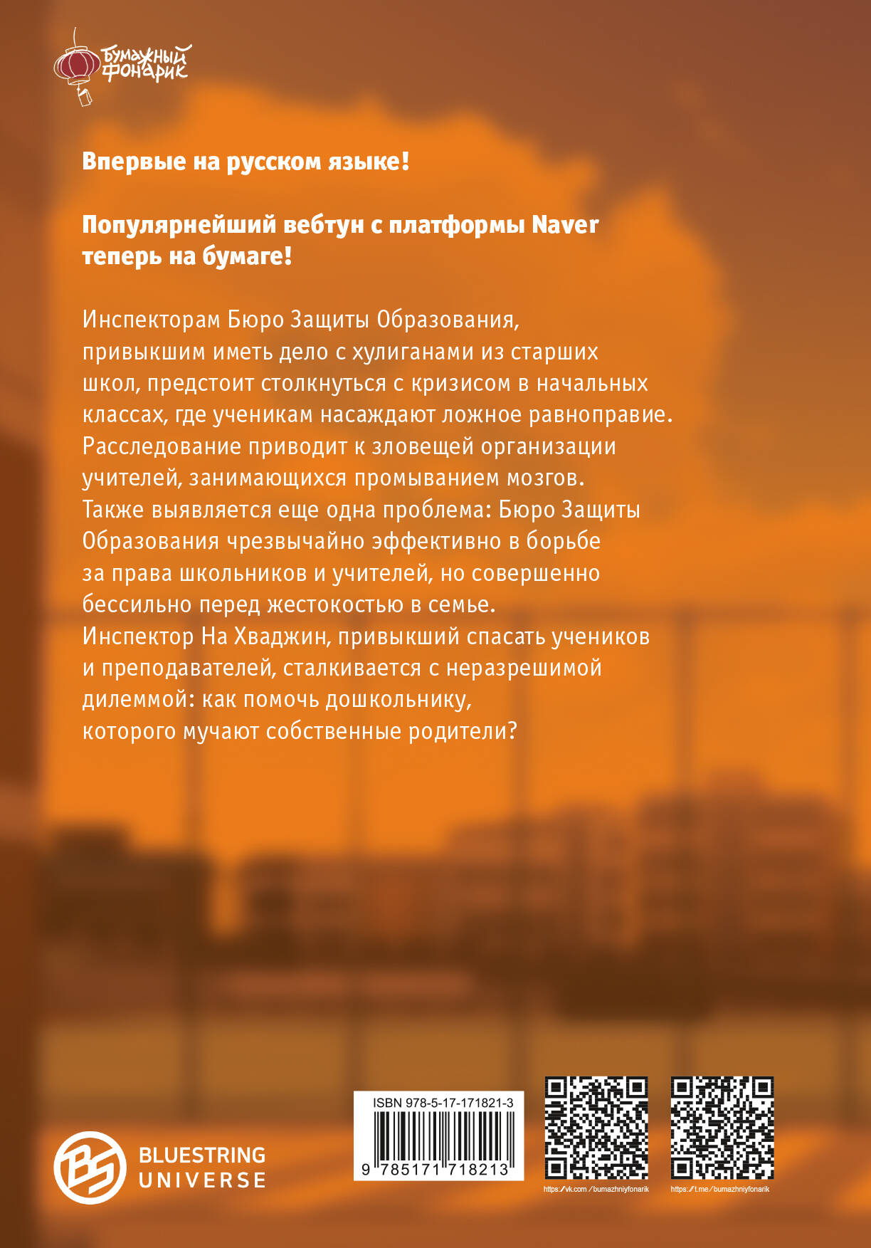 Впервые на русском языке популярнейший вебтун с платформы Naver! Инспекторы На Хваджин и Им Халлим продолжают свою деятельность, и на этот раз они отправляются в начальную школу, где ученики страдают от искаженного и насажденного учителем равноправия. В результате расследования выясняется, что за искусственным просвещением школьников стоит целая организация учителей, которые активно занимаются промыванием мозгов. Кроме того, Им Халлим помогает справиться с дедовщиной, завистью и буллингом в женском баскетбольном клубе. А На Хваджин сталкивается с серьезной проблемой, выходящей за рамки его юрисдикции: как помочь дошкольнику, если жестокость к нему проявляют даже не учителя или одноклассники, а его собственные родители. Методы Бюро Защиты Образования многим кажутся жестокими, но на самом деле они крайне эффективны, ведь с их помощью даже в самых неблагополучных школах устанавливается мир, а самые худшие хулиганы получают бесценный урок и осознают, что такое истинное образование. Для широкого круга читателей.