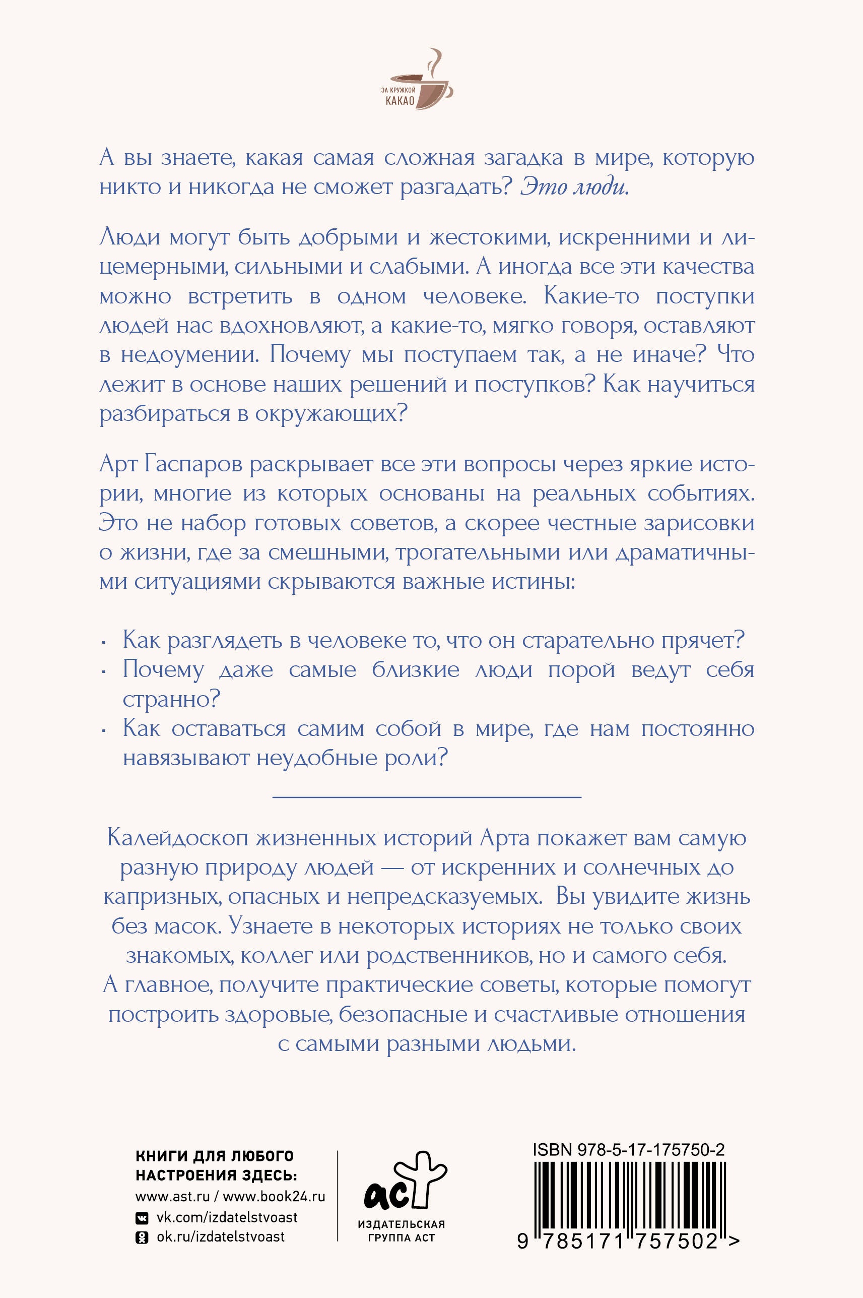 А вы знаете, какая самая сложная загадка в мире, которую никто и никогда не сможет разгадать? Это люди. Люди могут быть добрыми и жестокими, искренними и лицемерными, сильными и слабыми. А иногда все эти качества можно встретить в одном человеке. Какие-то поступки людей нас вдохновляют, а какие-то, мягко говоря, оставляют в недоумении. Почему мы поступаем так, а не иначе? Что лежит в основе наших решений и поступков? Как научиться разбираться в окружающих? Арт Гаспаров, который уже много лет изучает природу человеческого поведения (начиная со времен обучения в МГИМО и работы в дипломатии), в своей новой книге раскрывает все эти вопросы через яркие истории, многие из которых основаны на реальных событиях. Это не набор готовых советов, а скорее честные зарисовки о жизни, где за смешными, трогательными или драматичными ситуациями скрываются важные истины: • Как разглядеть в человеке то, что он старательно прячет? • Почему даже самые близкие люди порой ведут себя странно? • Как оставаться самим собой в мире, где нам постоянно навязывают неудобные роли? Калейдоскоп жизненных историй Арта покажет вам самую разную природу людей - от искренних и солнечных до капризных, опасных и непредсказуемых. Вы увидите жизнь без масок. Узнаете в некоторых историях не только своих знакомых, коллег или родственников, но и самого себя. А главное, получите практические советы, которые помогут построить здоровые, безопасные и счастливые отношения с самыми разными людьми.| Издательство | Издательство "АСТ" |