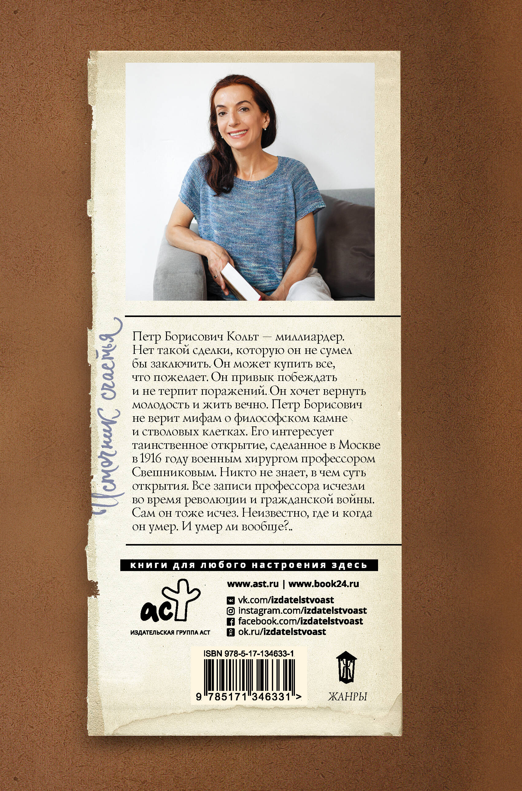 Петр Борисович Кольт - миллиардер. Нет такой сделки, которую он не сумел бы заключить. Он может купить все, что пожелает. Он привык побеждать и не терпит поражений. Он хочет вернуть молодость и жить вечно. Петр Борисович не верит мифам о философском камне и стволовых клетках. Его интересует таинственное открытие, сделанное в Москве в 1916 году военным хирургом профессором Свешниковым. Никто не знает, в чем суть открытия. Все записи профессора исчезли во время революции и гражданской войны. Сам он тоже исчез. Неизвестно, где и когда он умер. И умер ли вообще?..| Издательство | Издательство "АСТ" |