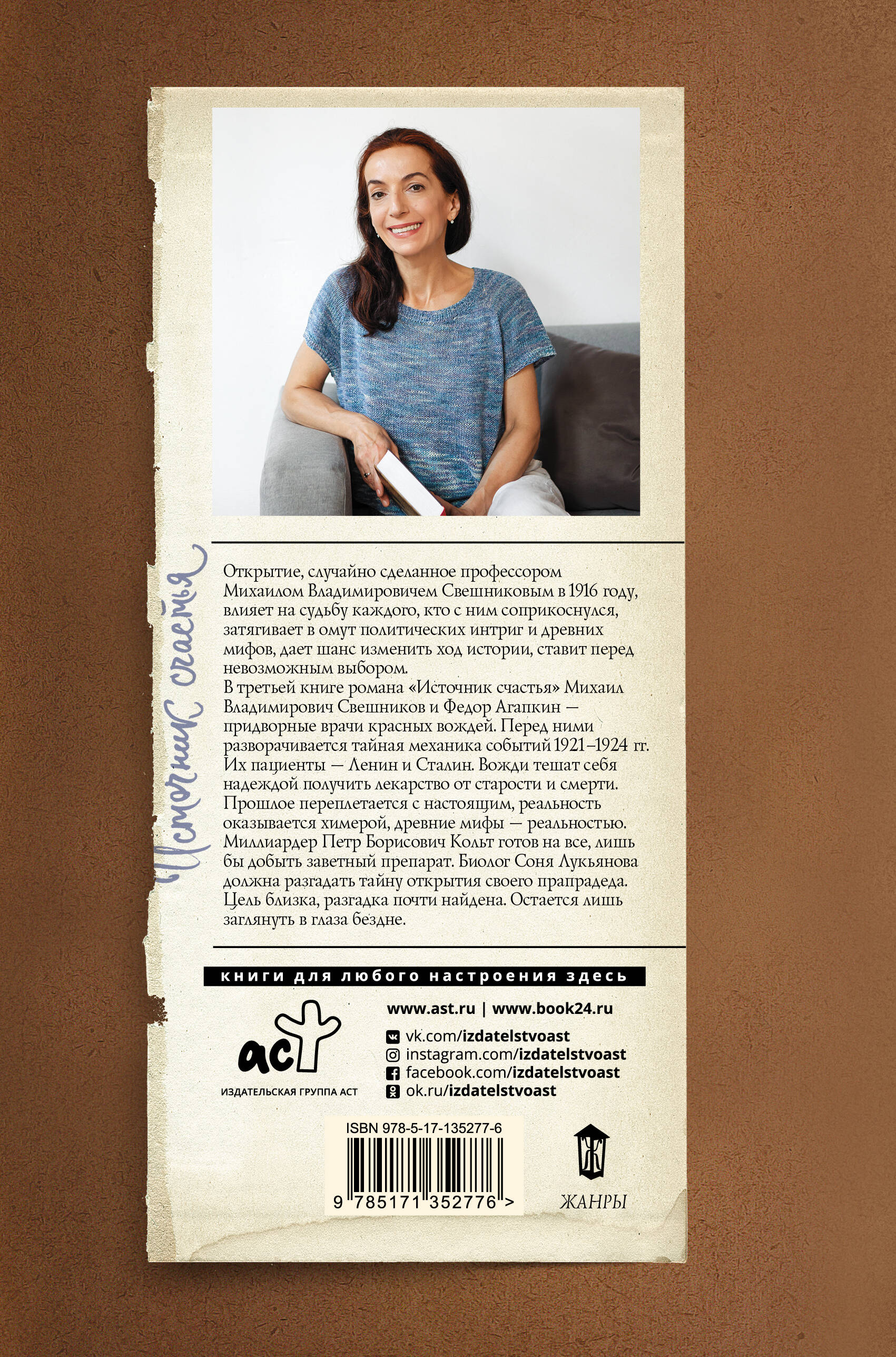 Открытие, случайно сделанное профессором Михаилом Владимировичем Свешниковым в 1916 году, влияет на судьбу каждого, кто с ним соприкоснулся, затягивает в омут политических интриг и древних мифов, дает шанс изменить ход истории, ставит перед невозможным выбором. В третьей книге романа "Источник счастья" Михаил Владимирович Свешников и Федор Агапкин - придворные врачи красных вождей. Перед ними разворачивается тайная механика событий 1921 - 1924 гг. Их пациенты - Ленин и Сталин. Вожди тешат себя надеждой получить лекарство от старости и смерти. Прошлое переплетается с настоящим, реальность оказывается химерой, древние мифы - реальностью. Миллиардер Петр Борисович Кольт готов на все, лишь бы добыть заветный препарат. Биолог Соня Лукьянова должна разгадать тайну открытия своего прапрадеда. Цель близка, разгадка почти найдена. Остается лишь заглянуть в глаза бездне.| Издательство | Издательство "АСТ" |