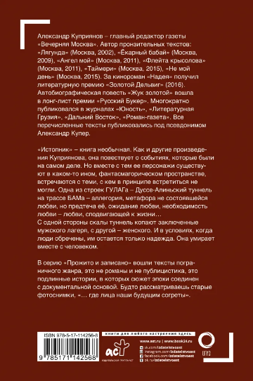 «Истопник» - книга необычная. Как и другие произведения Куприянова, она повествует о событиях, которые были на самом деле. Но вместе с тем ее персонажи существуют в каком-то ином, фантасмагорическом пространстве, встречаются с теми, с кем в принципе встретиться не могли. Одна из строек ГУЛАГа - Дуссе-Алиньский туннель на трассе БАМа - аллегория, метафора не состоявшейся любви, но предтеча её, ожидание любви, необходимость любви - любви, сподвигающей к жизни…