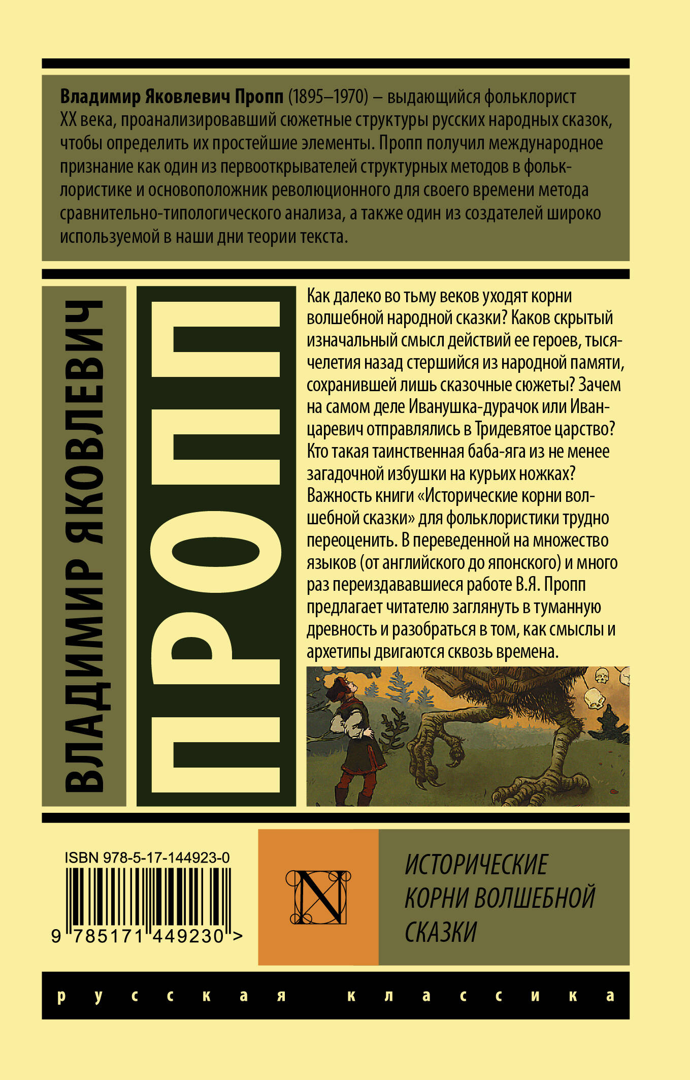 Как далеко во тьму веков уходят корни волшебной народной сказки? Каков скрытый изначальный смысл действий ее героев, тысячелетия назад стершийся из народной памяти, сохранившей лишь сказочные сюжеты? Зачем на самом деле Иванушка-дурачок или Иван-царевич отправлялись в Тридевятое царство? Кто такая таинственная Баба-яга из не менее загадочной избушки на курьих ножках? Важность книги "Исторические корни волшебной сказки" для фольклористики трудно переоценить. В переведенной на множество языков (от английского до японского) и много раз переиздававшейся работе В.Я. Пропп предлагает читателю заглянуть в туманную древность и разобраться в том, как смыслы и архетипы двигаются сквозь времена.| Издательство | ИЗДАТЕЛЬСТВО "АСТ" |