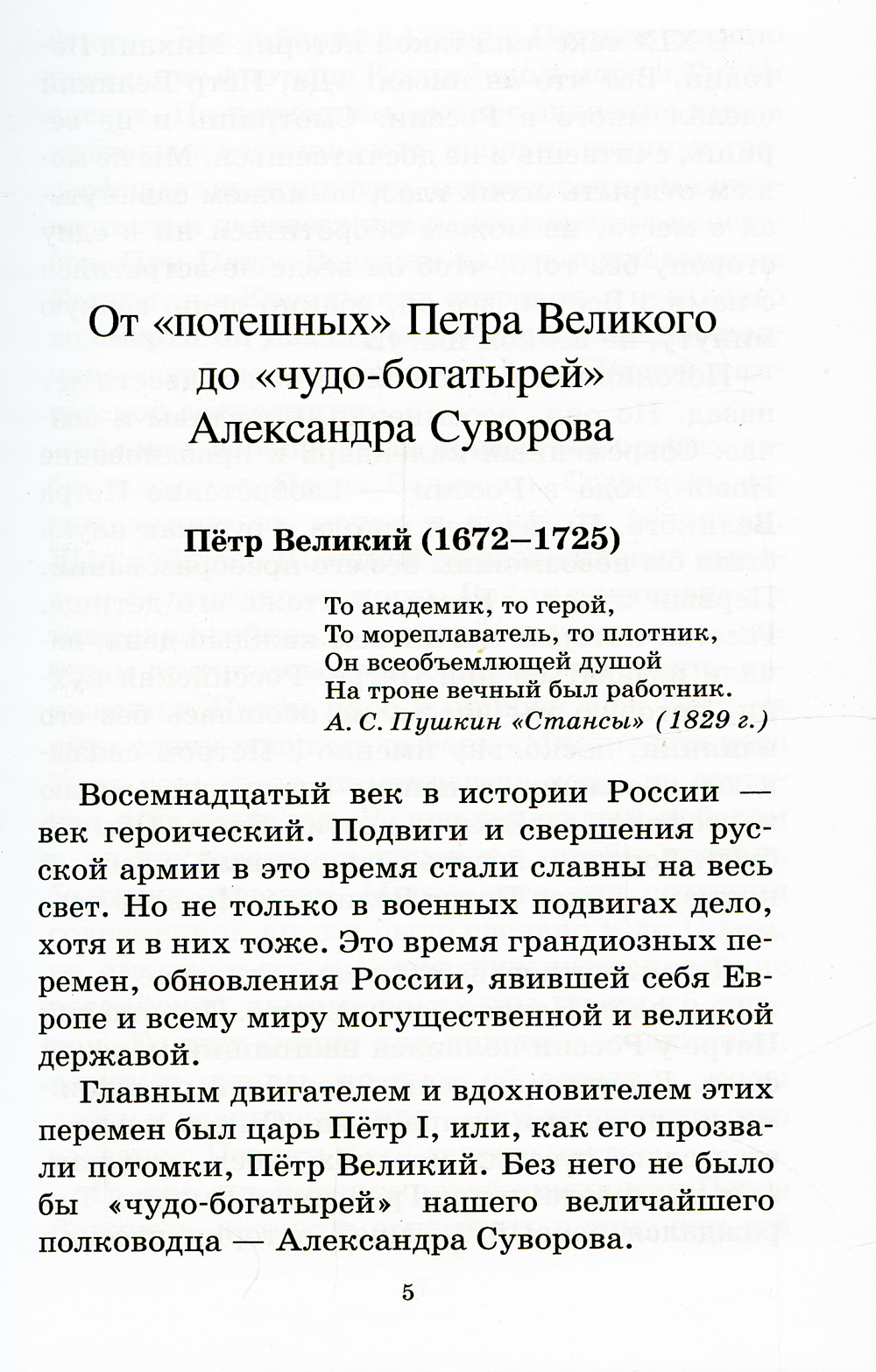 В книгу входят два цикла рассказов: о небольшом периоде правления императора-преобразователя Петра I (1672-1725) - от нарвского поражения в 1700 году до взятия русскими войсками этой крепости спустя четыре года - и величайшем полководце Александре Васильевиче Суворове (1730-1800). Многое объединяет этих двух героев русской истории восемнадцатого века. Оба были скромны в быту, оба реальные заслуги ставили выше наград, звучных титулов и орденов, оба отличались преданностью своему делу до последнего вздоха. И самое главное - оба безгранично были преданны России!