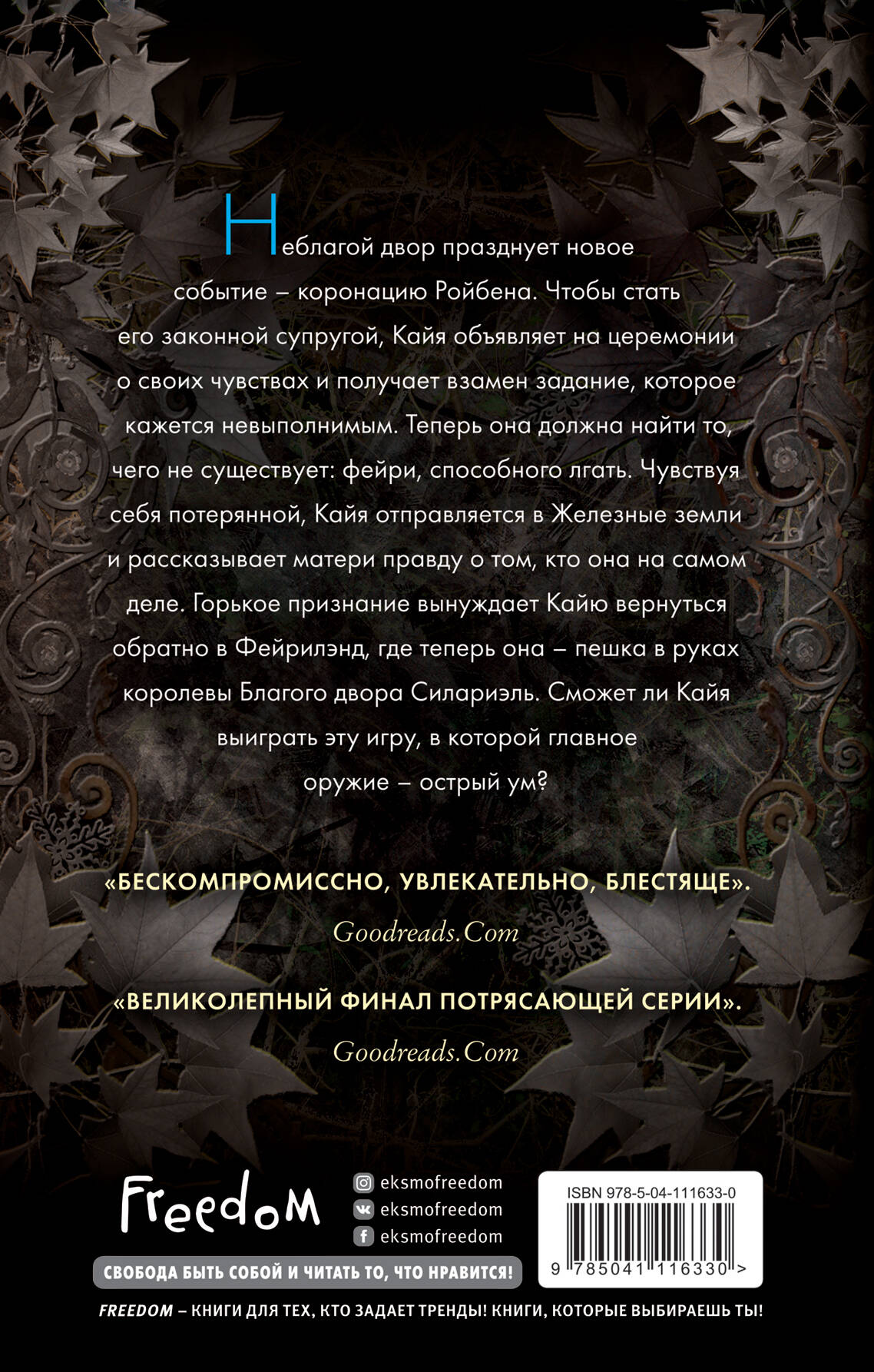 Завершающая часть трилогии о мире фейри - коварных, соблазнительных и безжалостных созданий! Прямое продолжение первой части цикла! Серия «Десятина», «Железные земли» - первый цикл Холли Блэк на тему фэйри, из которого родилась идея написать «Жестокого принца». Холли Блэк создала притягательную историю, болезненно реалистичную, но в то же время пугающе мистическую, об опасном мире, в котором удовольствие смешивается с болью, и все обыденное уже не может больше казаться таким. «Страшные игры разума, которыми завершается эта мрачная, пронзительная фантазия - обязательно к прочтению для преданных фанатов Холли Блэк!» - Booklist