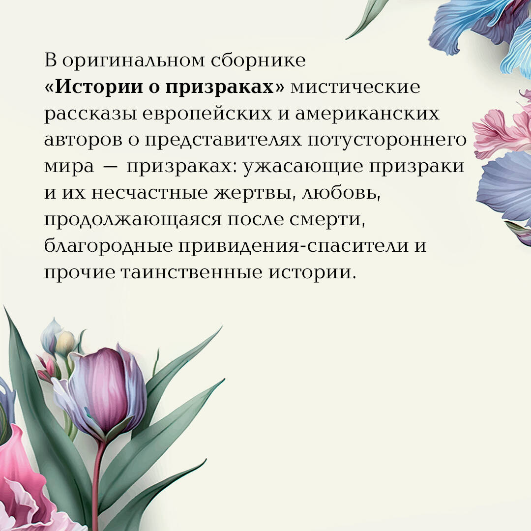 XIX век и начало ХХ-го - эпоха расцвета жанра страшного рассказа в литературе Старого и Нового света. В оригинальном сборнике «Истории о призраках» мистические рассказы европейских и американских авторов о представителях потустороннего мира - призраках: ужасающие призраки и их несчастные жертвы, любовь, продолжающаяся после смерти, благородные привидения-спасители и прочие таинственные истории. О драматичных, подчас смертельно опасных столкновениях обыденного и фантастически жуткого повествуют всемирно известные мэтры литературного мейнстрима (Генри Джеймс, Чарльз Диккенс, Джозеф Конрад), признанные мастера готической новеллистики (Джозеф Шеридан Ле Фаню, Амелия Эдвардс, Монтегю Родс Джеймс, Эдвард Фредерик Бенсон) и незаслуженно забытые ныне прозаики, такие как Эдит Уортон, Вернон Ли, Луиза Болдуин, Сэйбин Бэринг-Гулд, Персеваль Лэндон. Капсульная коллекция внутри серии «Элегантная классика»! Любовь многогранна, может вознести, а может разбить сердце. Любовь может идти рука об руку с притягательной тьмой, манящей в потусторонние миры. Поэтому в привычный макет серии мы добавили темные краски, убийственно красивые цветы, а также животных-проводников. Капсулу объединяет общая тематика мистического и картинка на корешке, внутри макет с иллюстрациями.| Издательство | ООО "Издательство "Эксмо" |