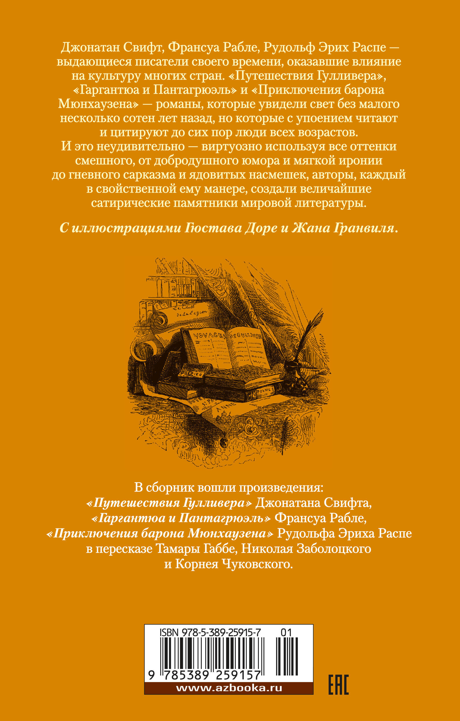Джонатан Свифт, Франсуа Рабле, Рудольф Эрих Распе - выдающиеся писатели своего времени, оказавшие влияние на культуру многих стран. "Путешествия Гулливера", "Гаргантюа и Пантагрюэль" и "Приключения барона Мюнхаузена" - романы, которые увидели свет без малого несколько сотен лет назад, но которые с упоением читают и цитируют до сих пор люди всех возрастов. И это неудивительно - виртуозно используя все оттенки смешного, от добродушного юмора и мягкой иронии до гневного сарказма и ядовитых насмешек, авторы, каждый в свойственной ему манере, создали величайшие сатирические памятники мировой литературы. Истории о путешествиях хирурга, а затем капитана Лемюэля Гулливера, о семье обжор-великанов и весёлые похождения барона Мюнхаузена вдохновили французских художников Гюстава Доре и Жана Гранвиля на создание иллюстраций, впоследствии ставших классическими.| Издательство | Азбука-Аттикус Издат.группа ООО |