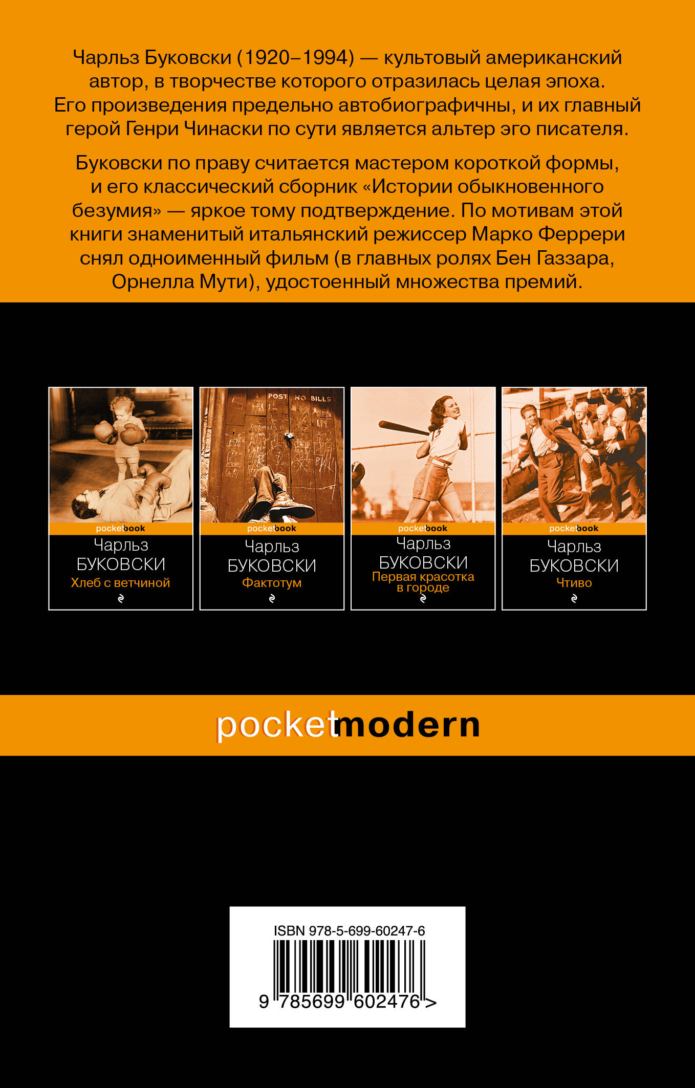 Чарльз Буковски - культовый американский писатель XX века, чья европейская популярность всегда обгоняла американскую. Несмотря на порою шокирующий натурализм, его тексты полны лиричности, даже своеобразной сентиментальности. Буковски по праву считается мастером короткой формы, и его классический сборник «Истории обыкновенного безумия» - яркое тому подтверждение: доводя свое фирменное владение словом до невероятного совершенства, Буковски проводит своего лирического героя - бабника и пьяницу, явное альтер эго автора, - по всем кругам современного ада. Именно по мотивам этой книги знаменитый итальянский режиссер Марко Феррери поставил одноименный фильм (в главных ролях Бен Газзара, Орнелла Мути), удостоенный премий ФИПРЕССИ на кинофестивале в Сан-Себастьяне и премий «Давид ди Донателло» сразу в нескольких категориях.| Издательство | Эксмо |